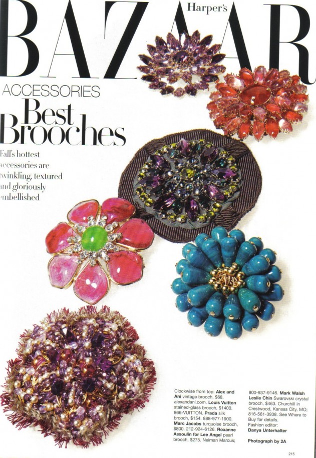 Harpers Bazaar, September 2004 Posted on September 1, 2004May 1, 2014 by LeslieMWLC Ruby and Lime Marguerite BroochHarpers Bazaar, Sept. 2004, MWLC Ruby/Lime “MARGUERITE” Brooch From “BEST Brooches Of The Season”.