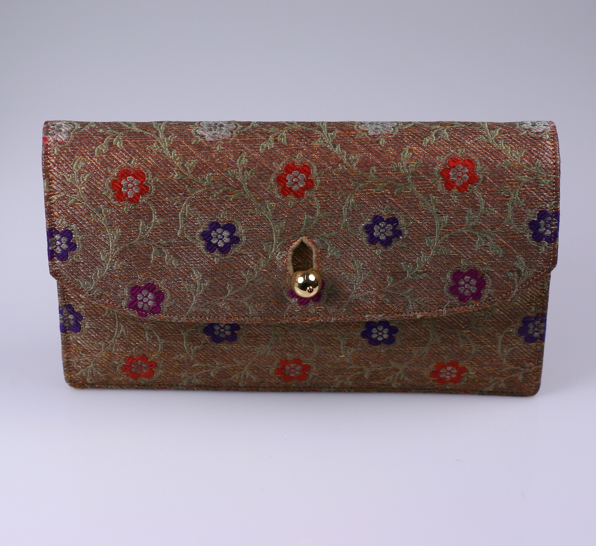 Elegant envelope clutch made antique metallic Indian textile with 14K gold ball and ruby clasp. Lined in peach silk satin with multiple compartments. USA 1950's.