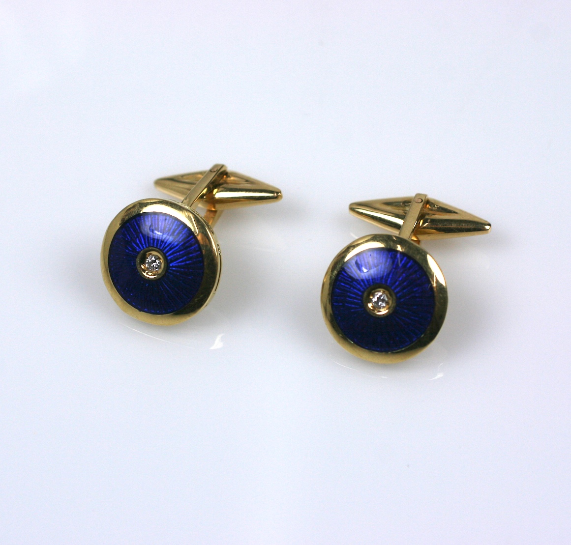 Deep cobalt blue enamel cufflinks with diamond centers. Toggle back fittings, all set in 18k yellow gold. Excellent condition.