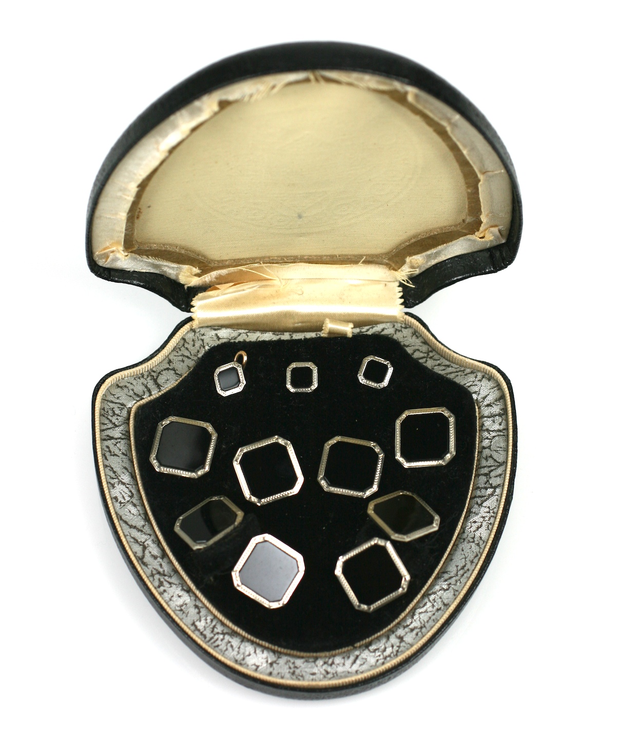 Krementz Onyx Tuxedo Stud Set in original Box from the 1920's. Full set with cuff links, 4 vest buttons and 3 shirt studs. Silver toned etched Deco borders with gilt metal backs. 1920's USA. Excellent condition.