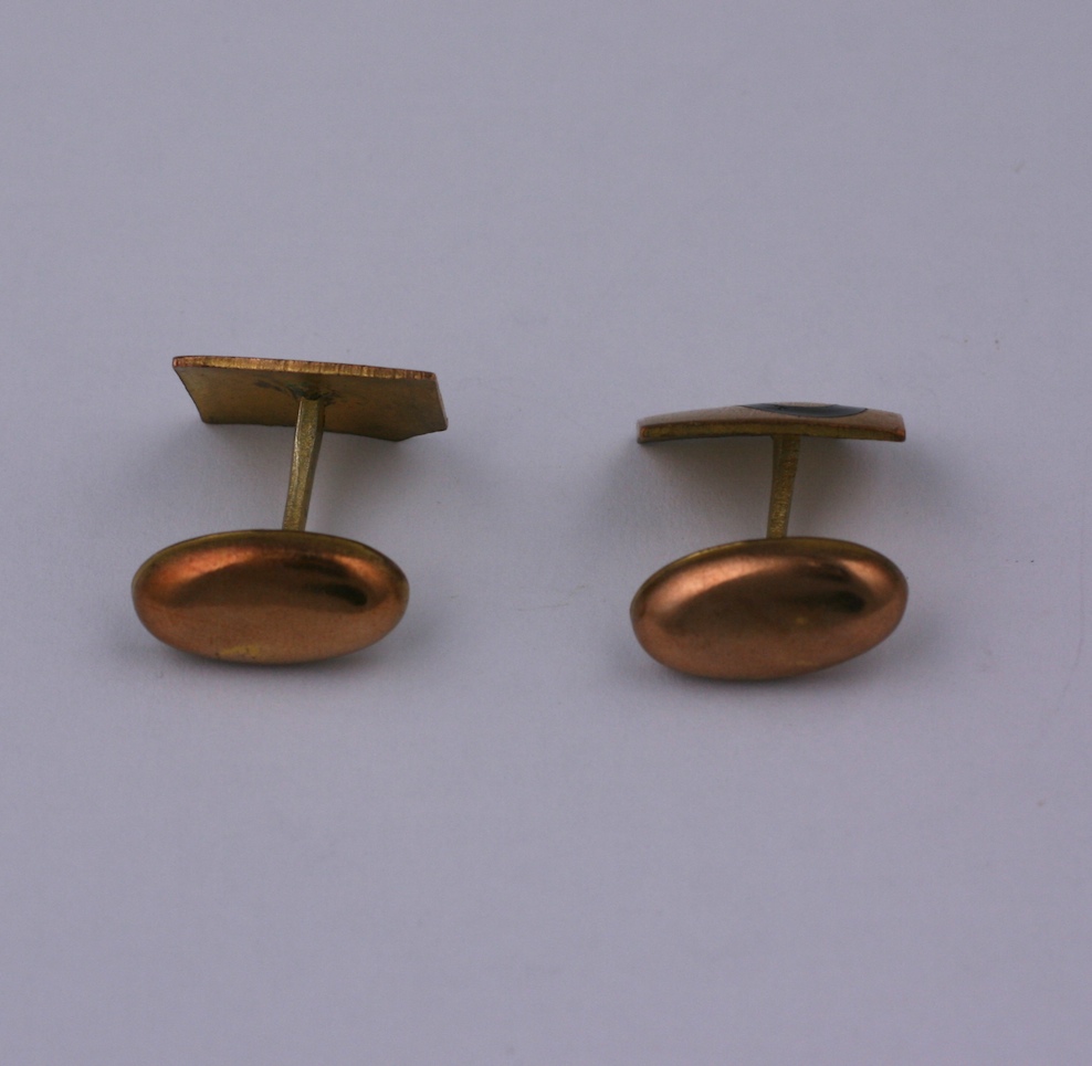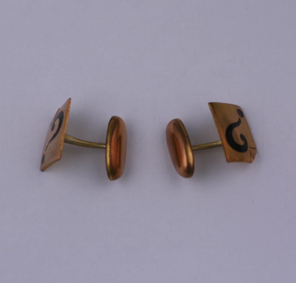 Charming Art Deco links with black enamel "questions" marks on gilt metal. A turned corner on the edge adds additional interest. Back paddles have hinges for entry onto cuff. 1930's USA. Face top .6" x .5".