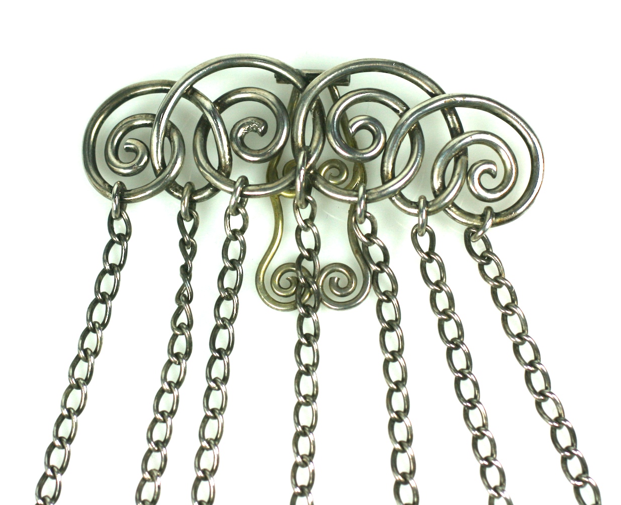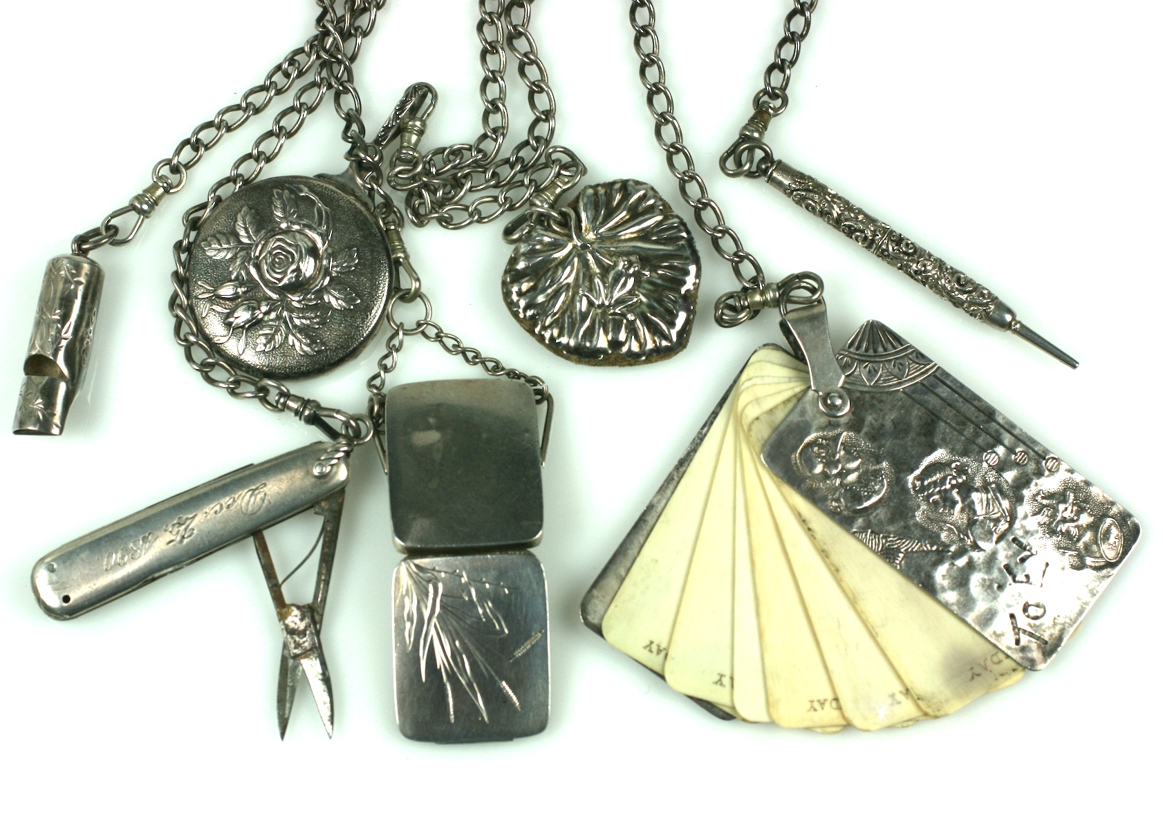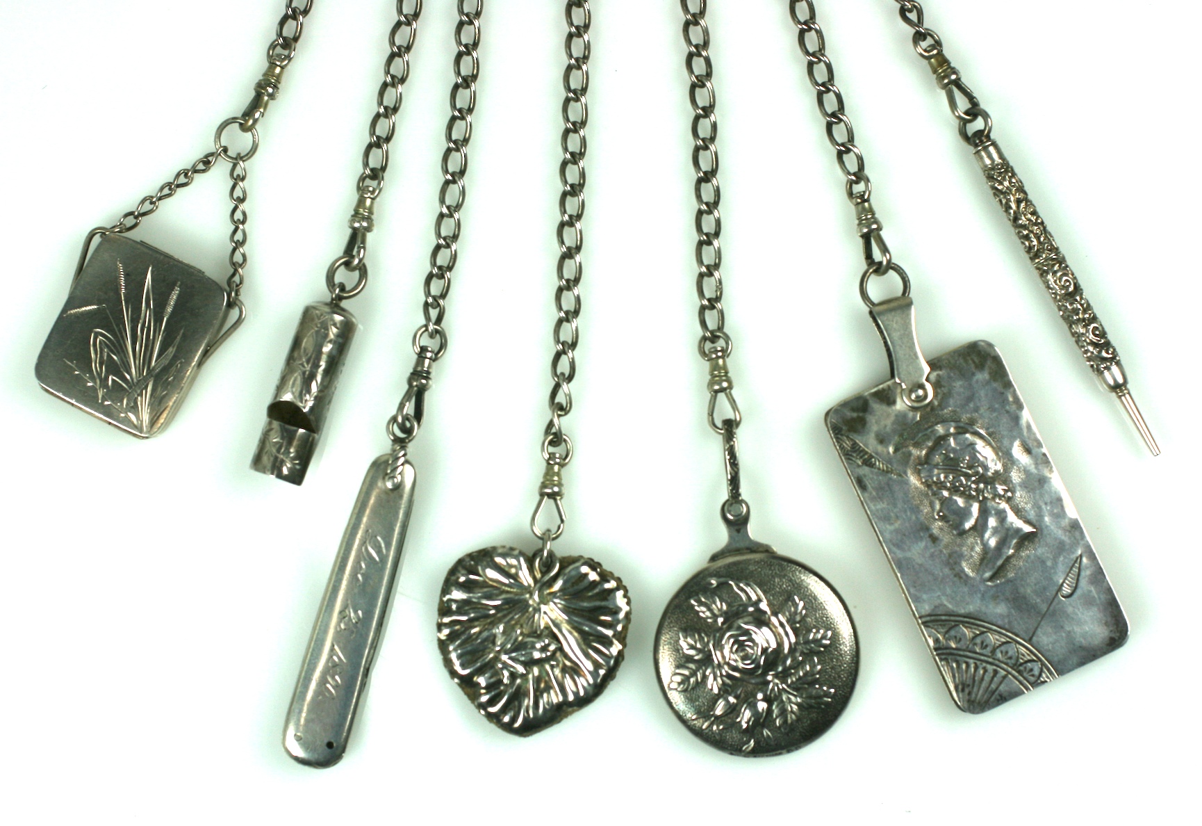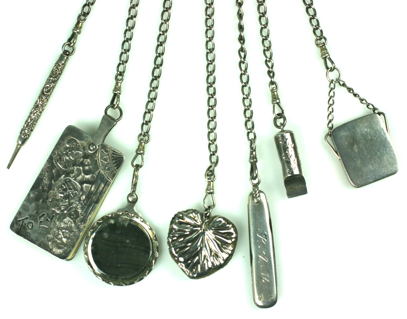 Lovely Victorian Sterling Chatelaine circa 1870 with all the necessities for the modern woman. Today, everything is integrated into a PDA but your iphone still cant whistle, carry stamps or sewing needles like this period chateliane can. Chatelaines became the rage for women of every economic background in the 19th Century. They could be easily customized to your needs, whether you were a society hostess, nurse or secretary. Often fully intact and original chatelaines can tell the story of its owner and as well as her station in life. This particular chatelaine comes from a wealthy individual. The accessories are original to the clip (which is attached to a belt or waistband) and are indicative of the daily needs of this client. Attached are a very collectible notepad with celluloid date pages by the Schiebler company in the Aesthetic style as well as a stamp holder, pin holder (frog on lily pad), retractable pencil, rose decorated mirror, pen knife with scissors/blades and an engraved whistle. In the 19th Century, a massive industry was born supplying all sorts of trinkets, both practical and some purely decorative, to stock these Victorian daily assistants (VDA's). Excellent condition. 1870's USA.