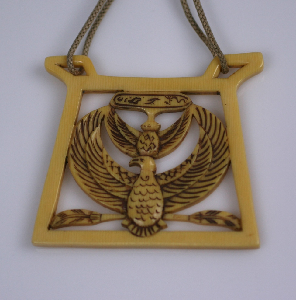 A cartouche at top has hieroglyphs of birds and a serpent. The same cartouche is also on the reverse. Made of thick pierced ivorine or celluloid, the hand carved details are highlighted with a tan patinaed stain.