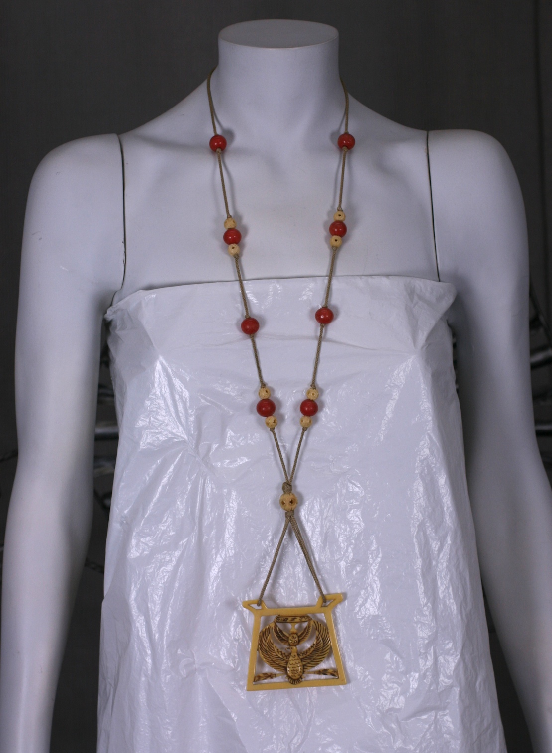 The pendant is strung on a long braided cotton cord with and carved bone and coral bakelite knotted beads. pendant, Width 3", Drop Length from central bead 5.5", Bead Necklace 33", 3/16" depth. 1920's France.