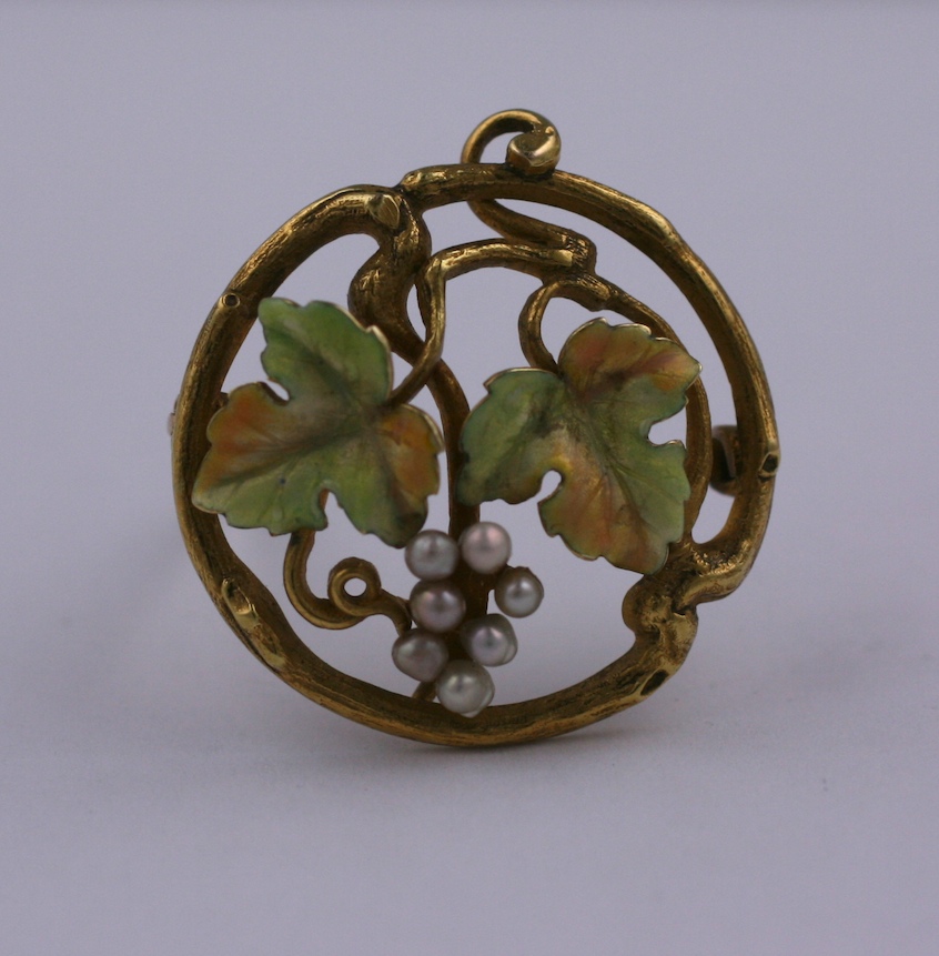 Art Nouveau 14K gold, enamel and pearl grape motif brooch from the early 20th Century. Coiled vine on top cleverly creates a loop for a pendant chain if desired. Made in Newark, NJ, the jewelry hub at the turn of the 20th Century.