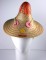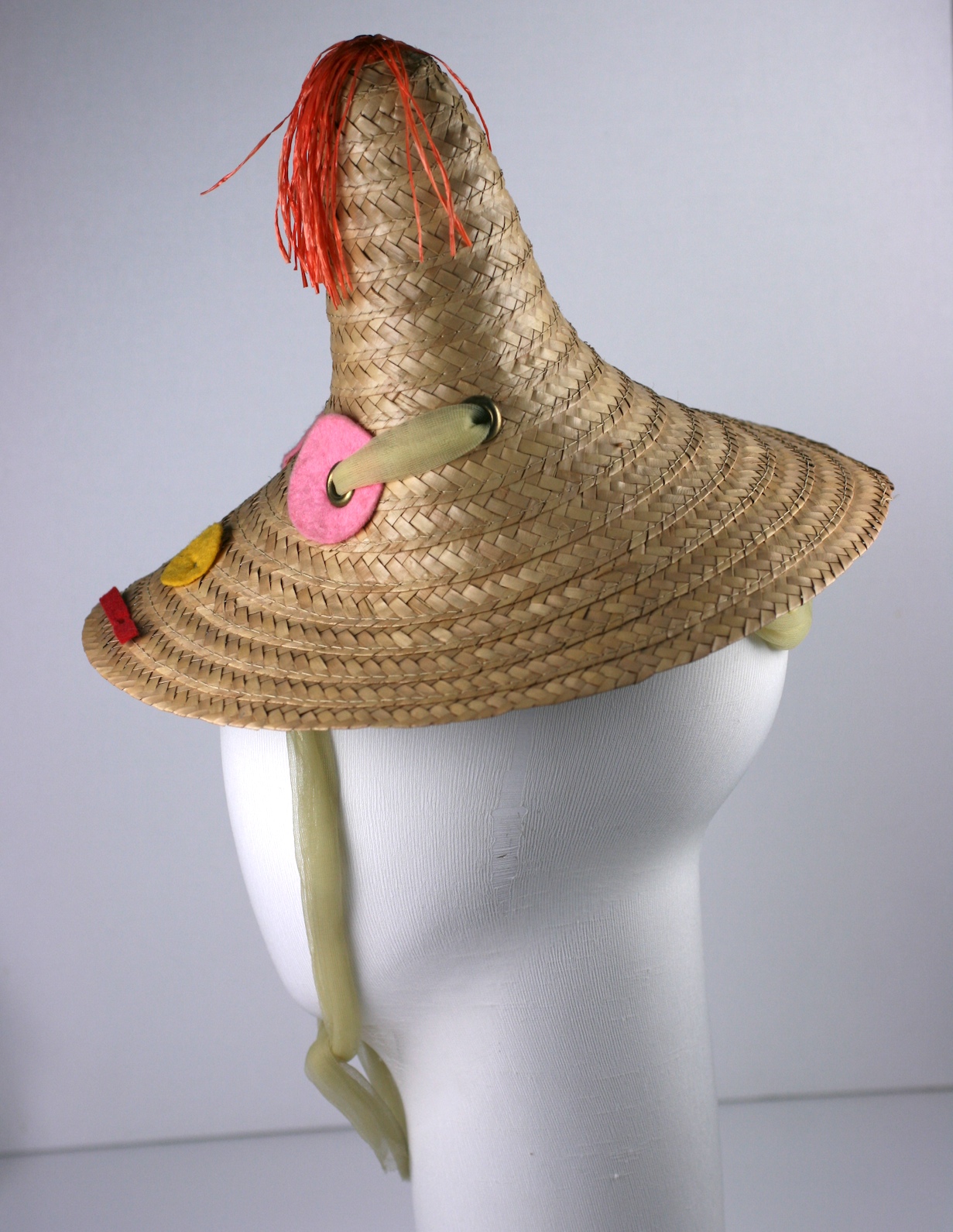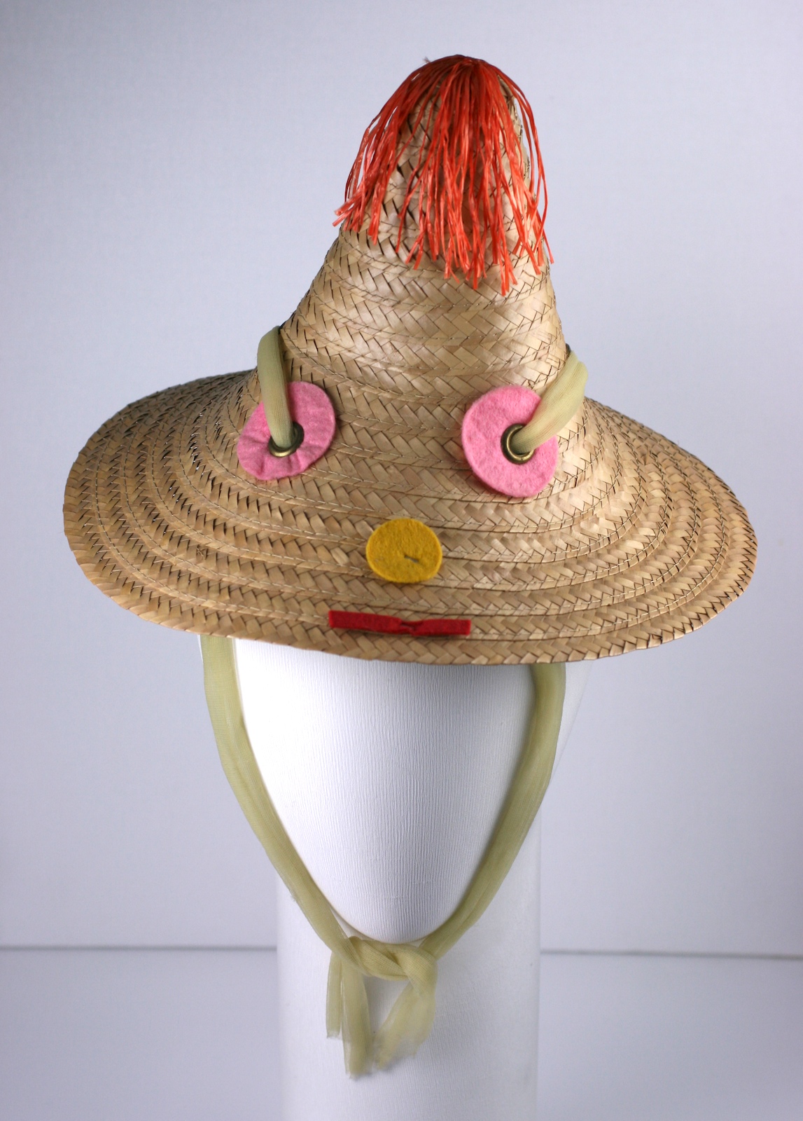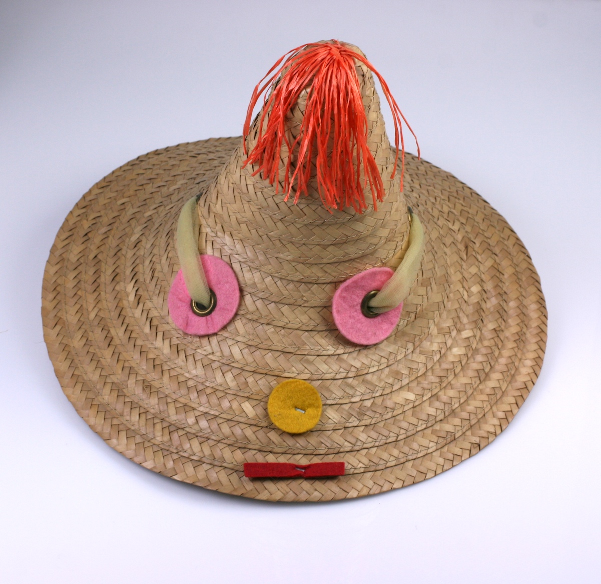 A "Mr. Bill" type figure is felt decorated (stapled!) onto a cone shaped straw with an orange pom pom topper. There is a pale yellow nylon ribbon that runs over the hat and under the brim to tie as desired. Charming and ridiculous in the best way. 11" across, Height 8". Excellent condition. 1960's Italy.
