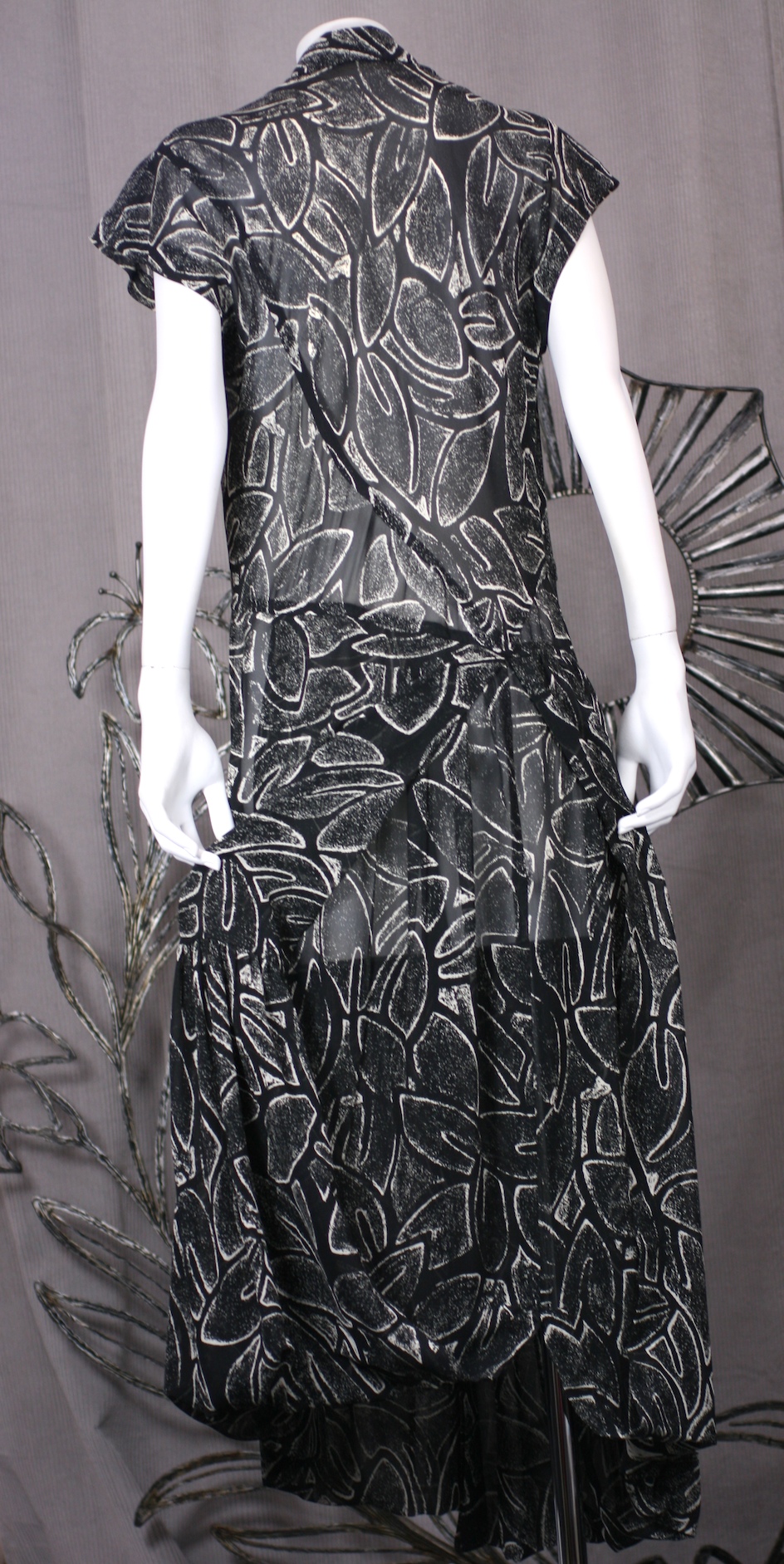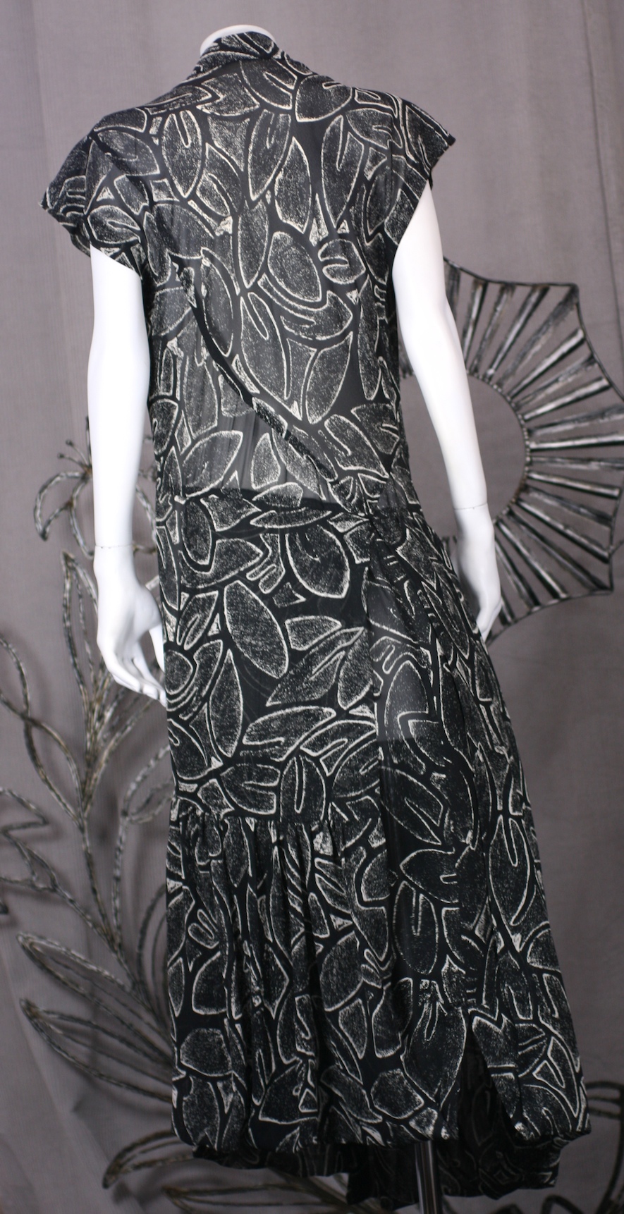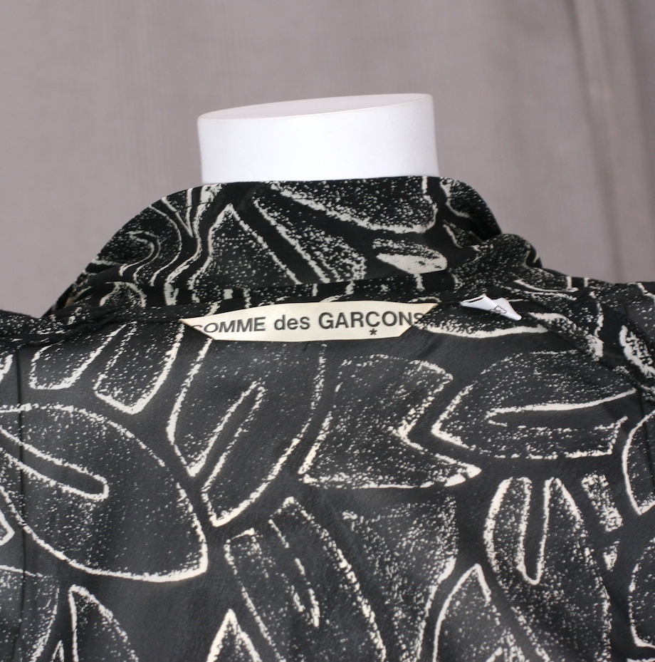 Early Comme des Garcons Shirt Dress of graphic black/white leaf printed sheer georgette with unusual seaming, ruffles and doubled hems which form bellows when one walks. Hem is assymetrical and the doubled hem is caught and split open off a back hip seam. Mother of pearl buttons.