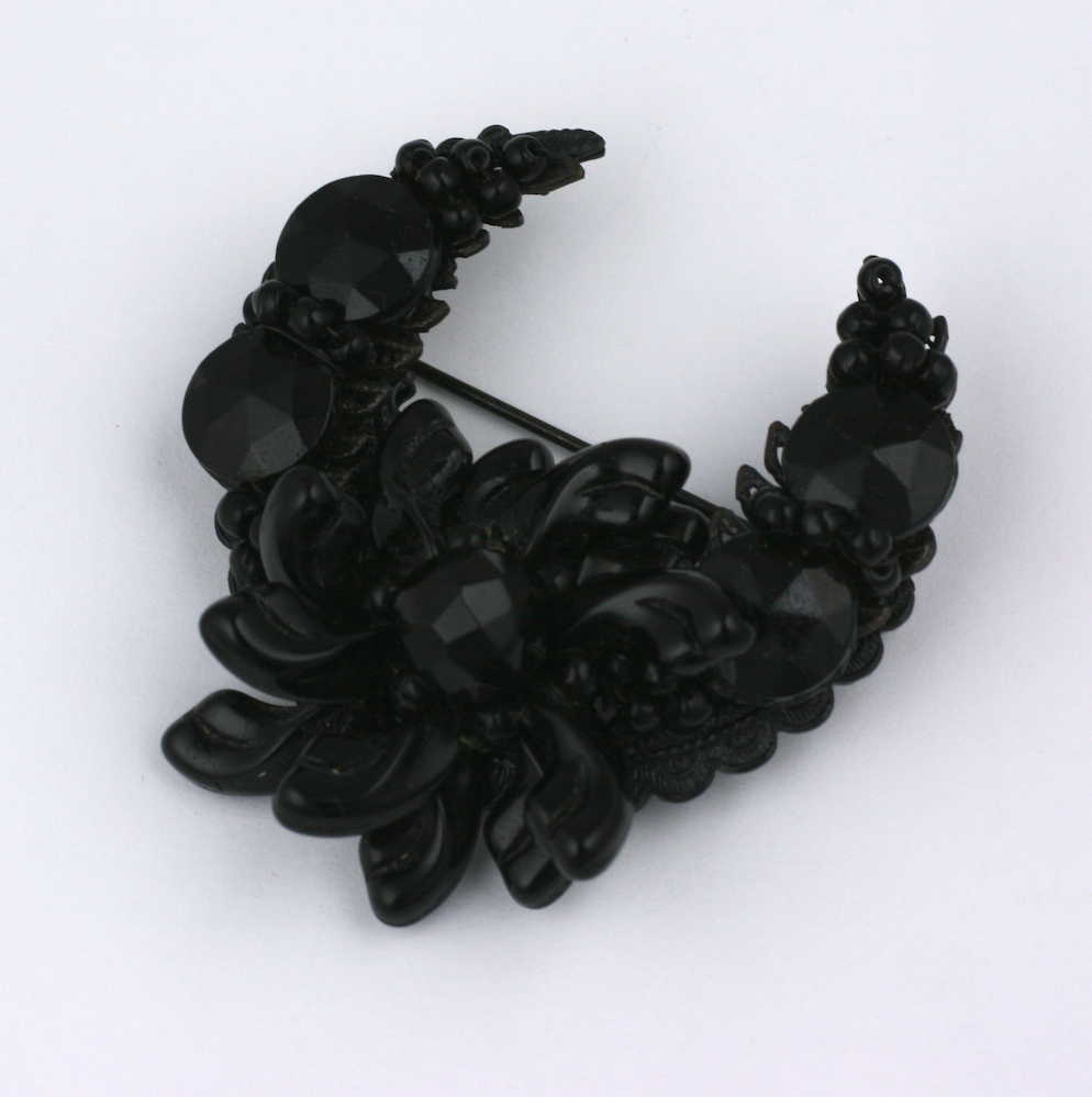Miriam Haskell Victorian revival brooch with jet and black pate de verre petal beads set on japanned metal. 1950's USA. Excellent condition.