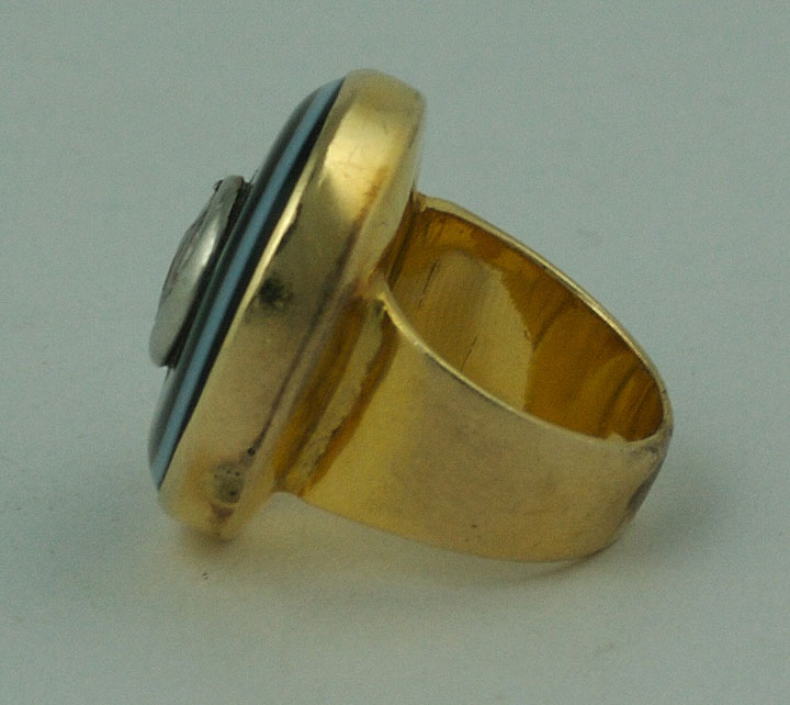 Amazing and unusual custom ring of a large banded agate set with a carved "Man in the Moon" diamond. Heavy 14K gold shank.