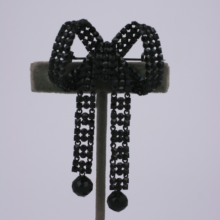 Victorian french jet bow brooch from the late 19th Century.France. the looped bow composed of square and round french cut jets,the bow tails are articulated terminating in faceted jet rounds.Excellent condition.