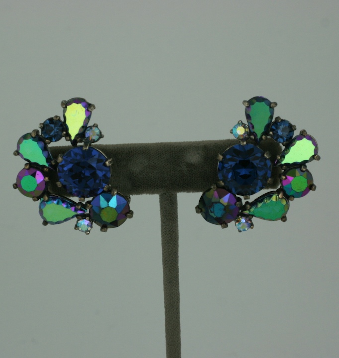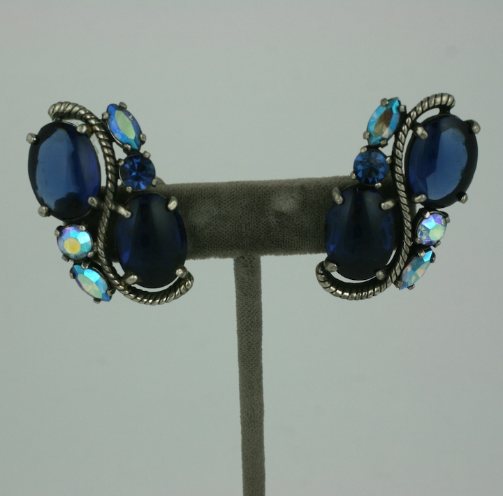 Schiaparelli's "S" earclips of deep sapphire cabochons and iridized cut stones which are set in antiqued silvered metal with clip back fittings.