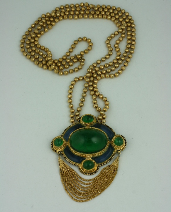 Beautiful pendant necklace by Dior of poured glass stations and cabochons in emerald and sapphire. Executed by the Grosse in Germany for Dior the 1970s, France. Swags of fox chain sway under the pendant which is suspended from a double length textured ball chain.