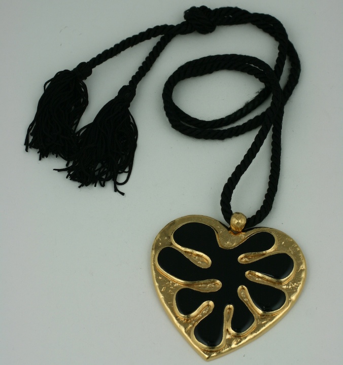 Hammered gold Yves Saint Laurent pendant with Matisse inspired black enamel abstract motif. Black silk tassel cording used for necklace.