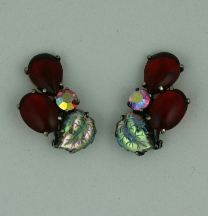 Schiaparelli's iridized leaf and cabochon ruby earclips are set in antiqued silvered metal with clip back fittings.