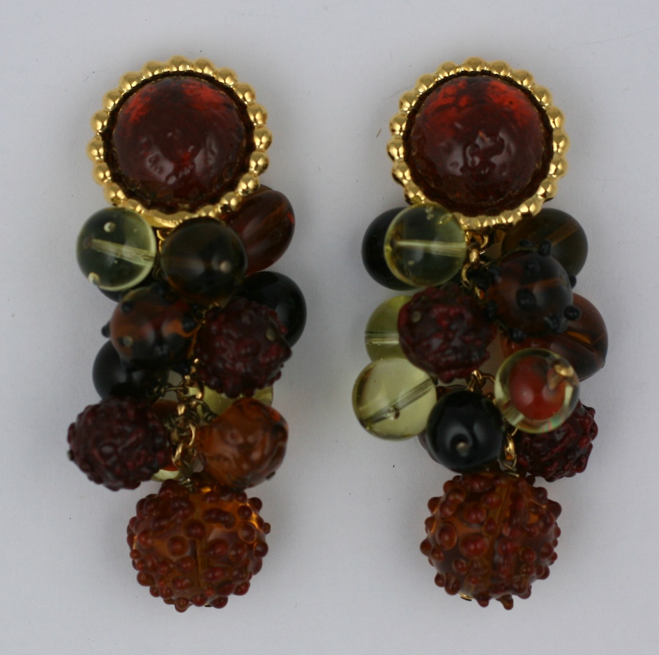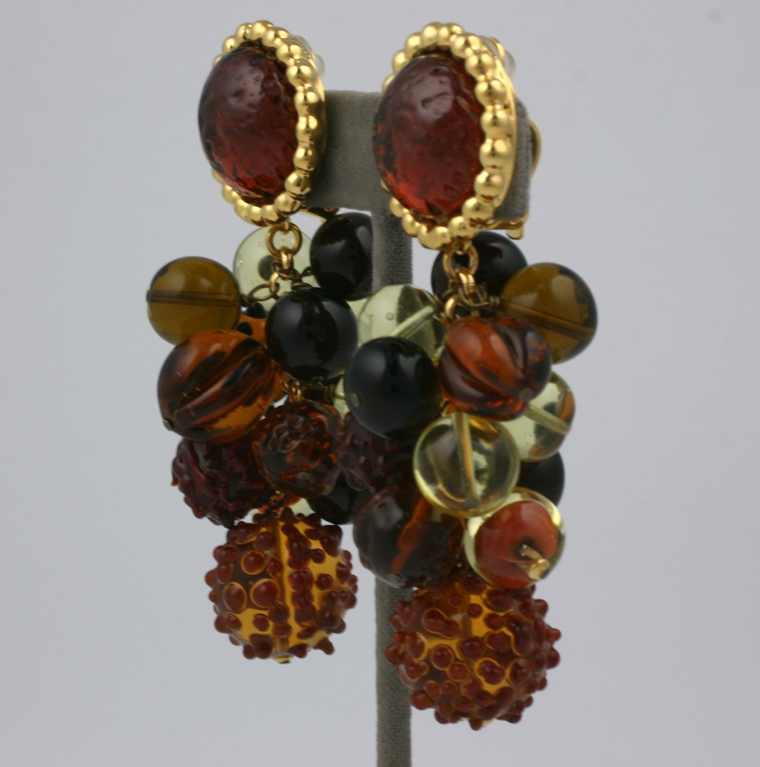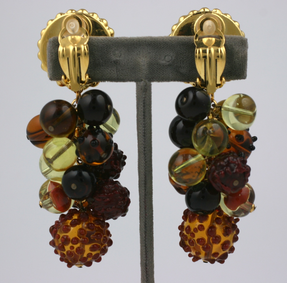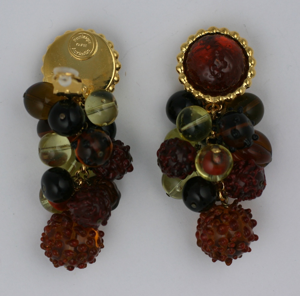 Dominique Aurientis oversized Pate de Verre fruit cluster earrings in tones of topaz and citrine with wonderful lamp worked detailing. Completely handmade by the Gripoix studios for Dominique Aurietis with clip back fittings. France 1980's. 3" x 1.5". Excellent condition.