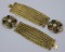 Wonderful pair of Chanel bracelets in antique gold finish with center medallions of poured glass and strass stones. Poured glass in tones of amythest, ruby, emerald and sapphire. Flat textured link chains form the base of the bracelets. Large size.