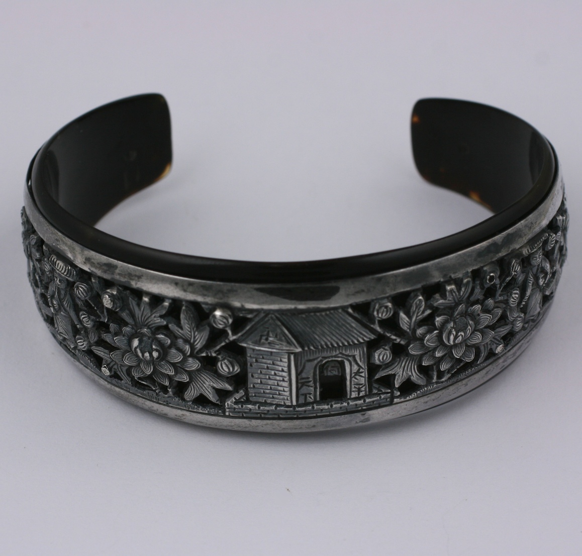 Antique Chinese bracelet. A silver hand raised decorated band is bolted onto a tortoiseshell base. Motifs centers around a house bordered by floral blossoms. 1920’s China. Excellent condition. Domestic Sales ONLY.
