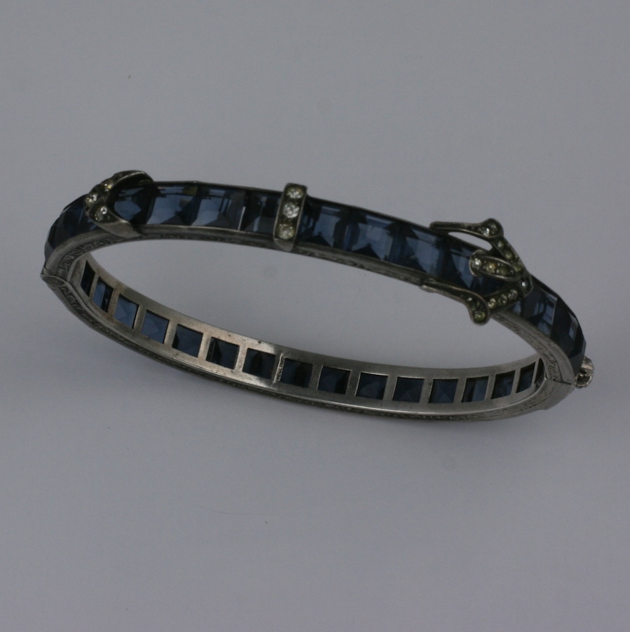 Art Deco Channel Set Bangle with square set faux sapphires and paste set buckle motif in sterling. Side tongue closure with unusual self lock. Bangle .25″ wide, buckle .5″ width. Interior diameter 2.5″ x 2″.