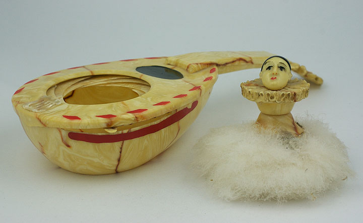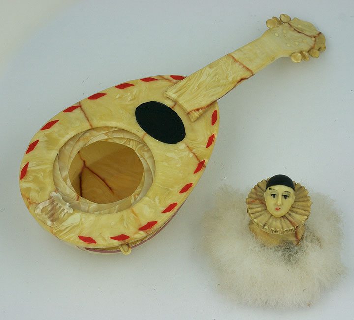 French figural powder puff of Pierrot hidden in a celluloid mandolin.