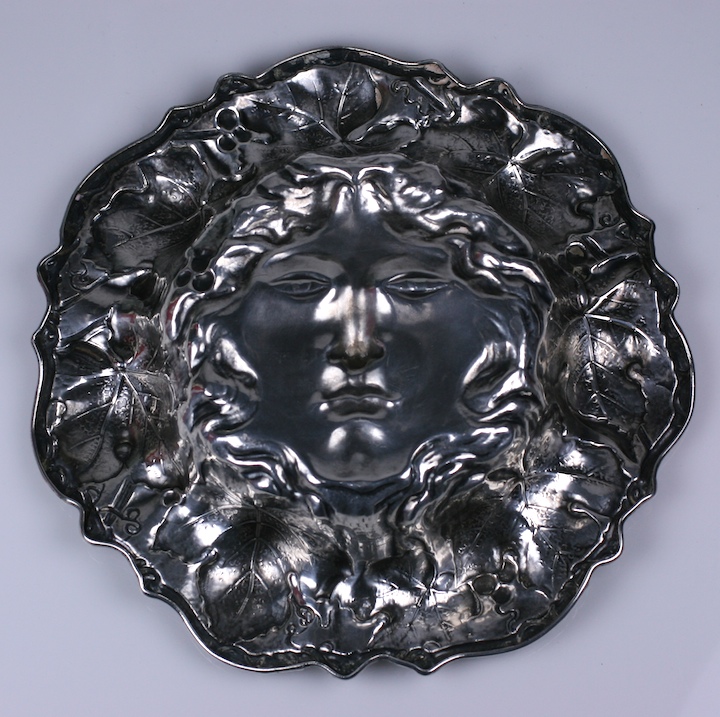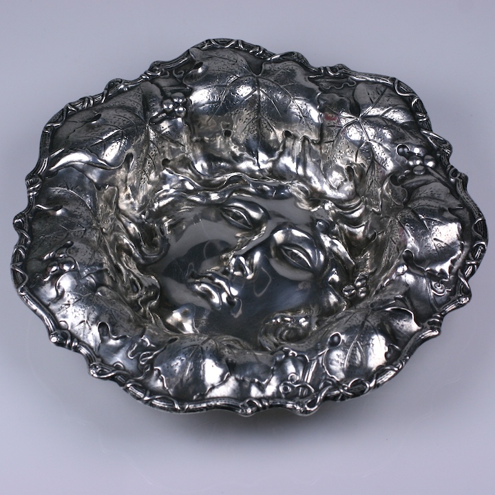 Unusual figural sterling fruit bowl from the early 20th Century. An Art Nouveau maiden's face is centered in the base of the bowl with her hair strewn with leaves and berries in high repousse along the large decorated lip.
