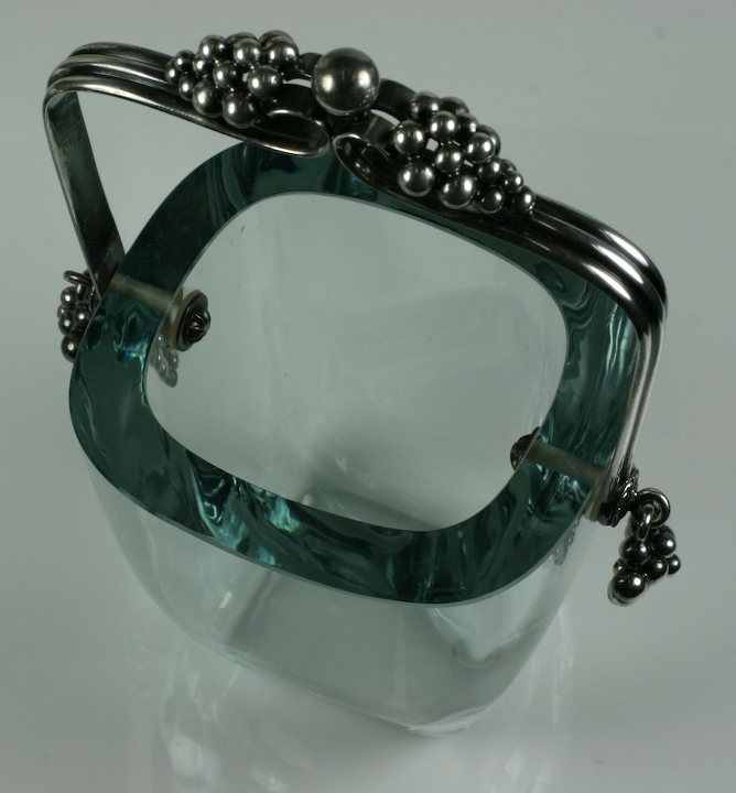 Beautifully crafted Jensen-esque ice bucket of crystal and sterling from the 1950's. Sterling grape clusters hang from the similarly decorated, ribbed and hinged handle. Beautiful quality and workmanship. Denmark.