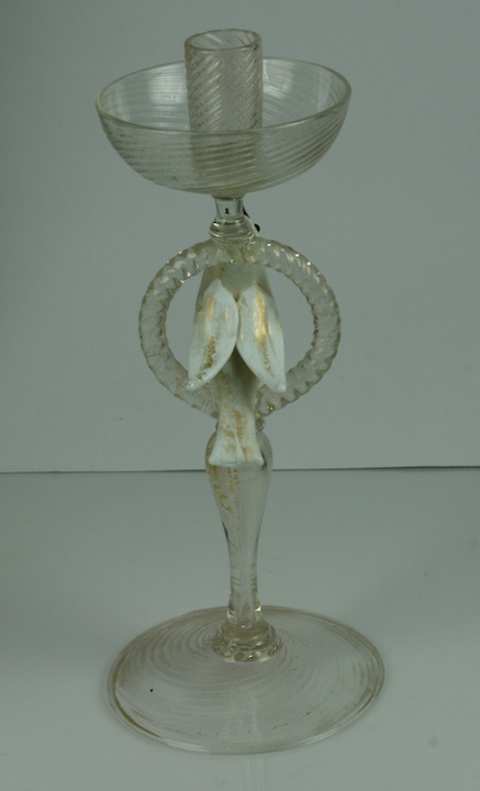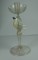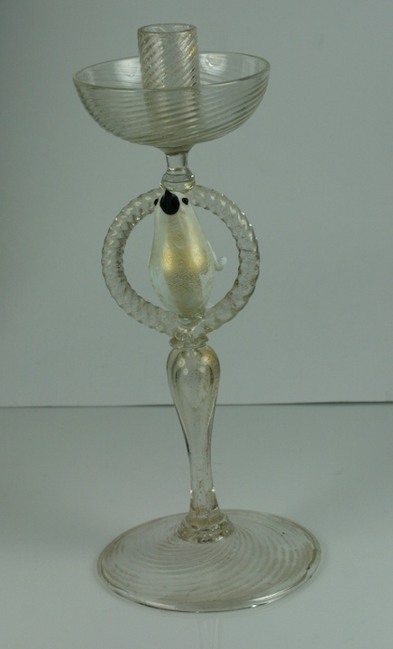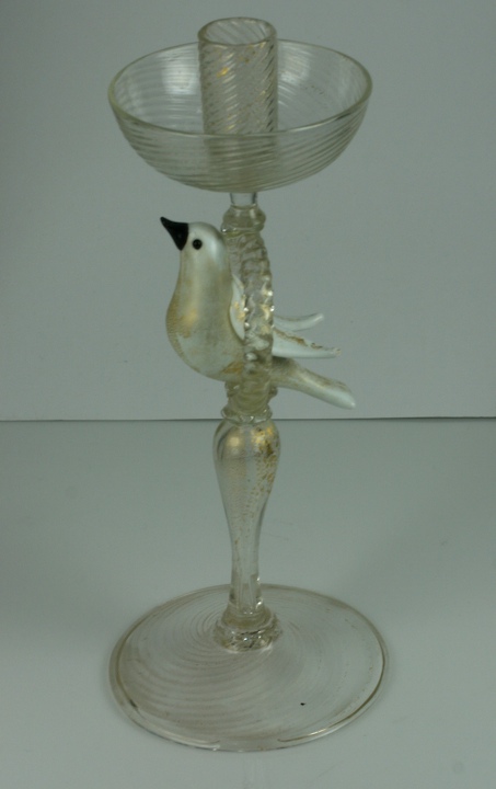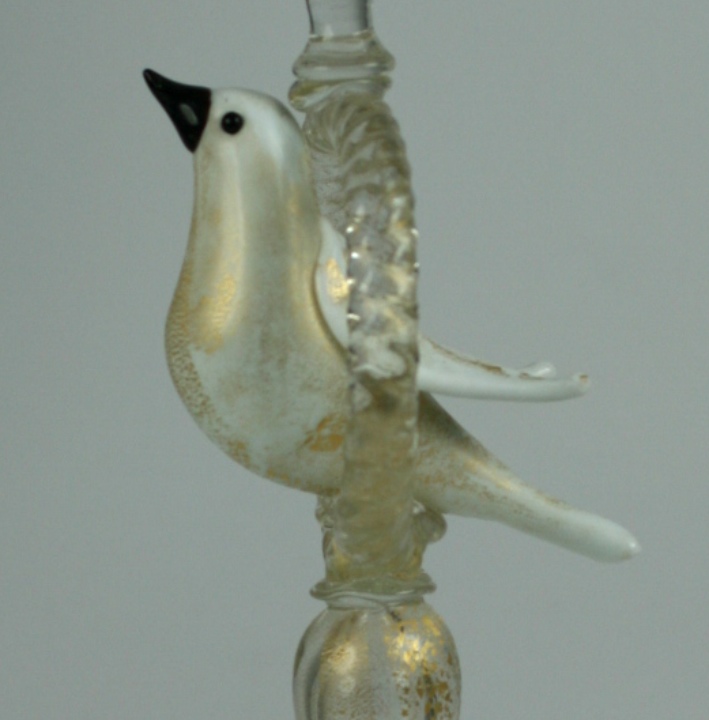 Unusual handblown glass candlestick Murano Italy. An opalescent gilt bird on a perch is the central motif. Circa 1950's. Excellent condition.