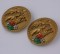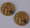 Miriam Haskell's pair of chinoiserie brooches depicting medieval style chinese figures in a palace landscape. Of siqnature Russian gold plate further hand embellished with faux coral, jade, and baroque pearls.