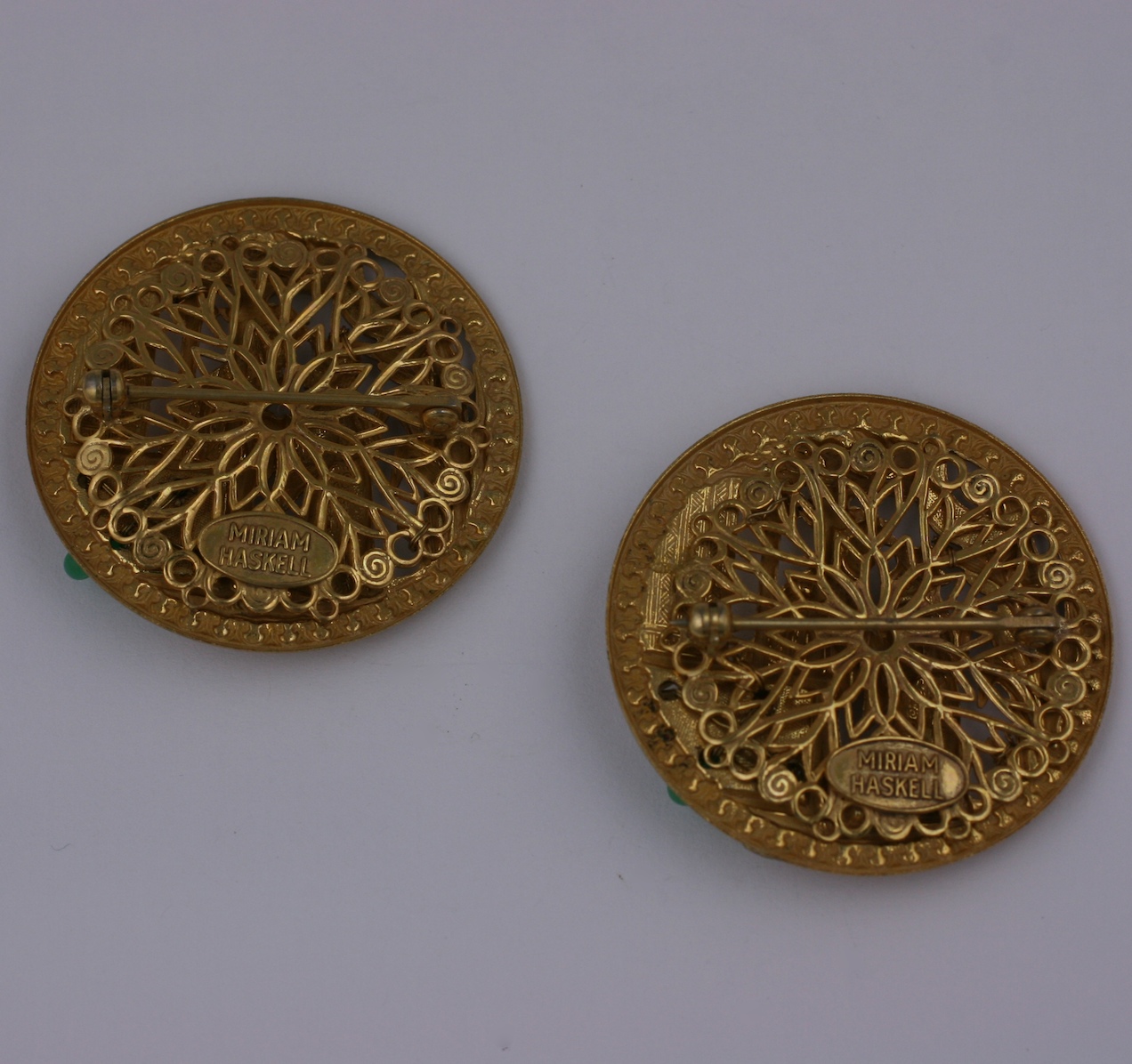 Miriam Haskell's pair of chinoiserie brooches depicting medieval style chinese figures in a palace landscape. Of siqnature Russian gold plate further hand embellished with faux coral, jade, and baroque pearls.