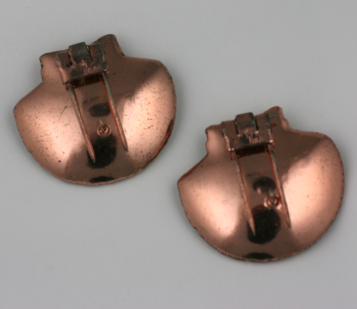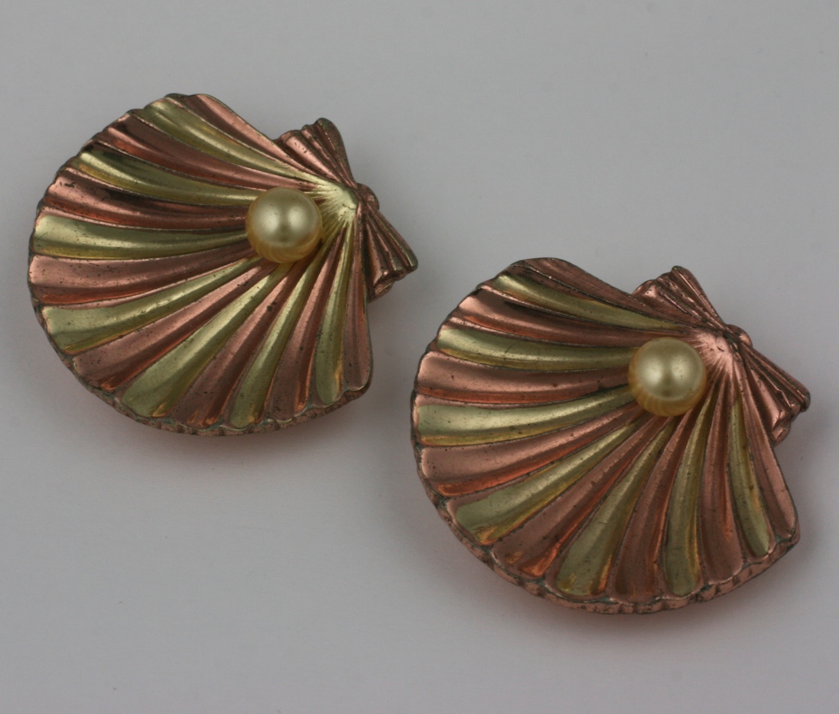 Elegant Trifari retro two tone pink gold and yellow gold striped scallop fur clip brooches with faux pearls. 1.5" x 1.4". 1940's USA.