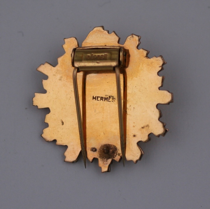 Hermes Apollo rare 1950s fur clip.Gilt bronze double layered sun rays, center mounted by the head of a young Apollo.