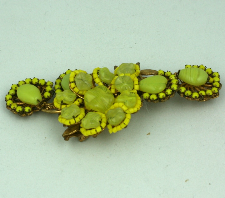 Miriam Haskell's limencello hued pate de verre brooch with signature ornate hand embroidered bead work. Large scaled brooch in amazing condition from the 1940's USA. Amazing color. 3.75" x 2".