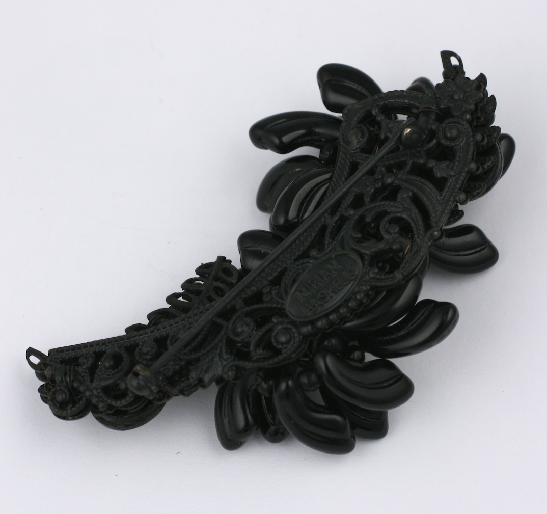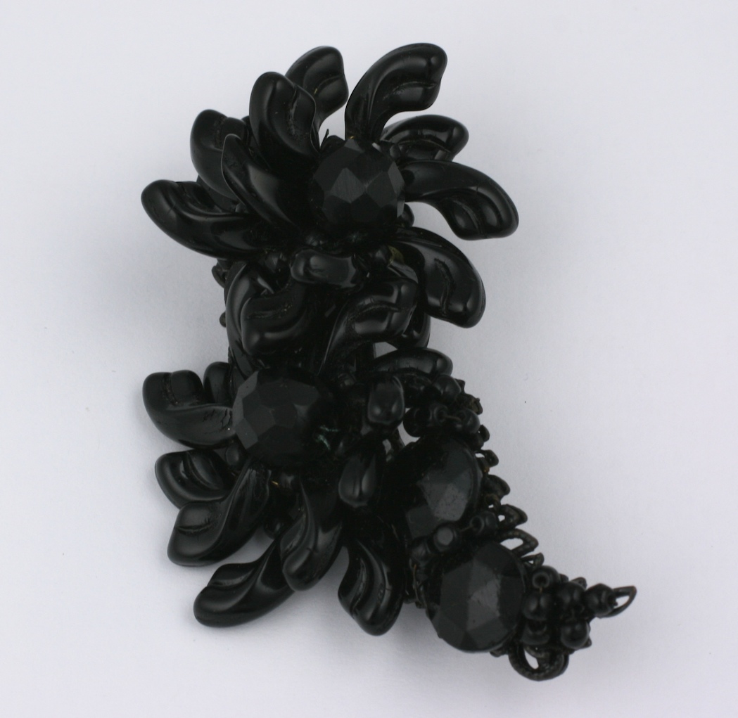 Miriam Haskell's Victorian revival festoon brooch jet and black pate de verre petal beads set on japanned metal. 1950's USA.