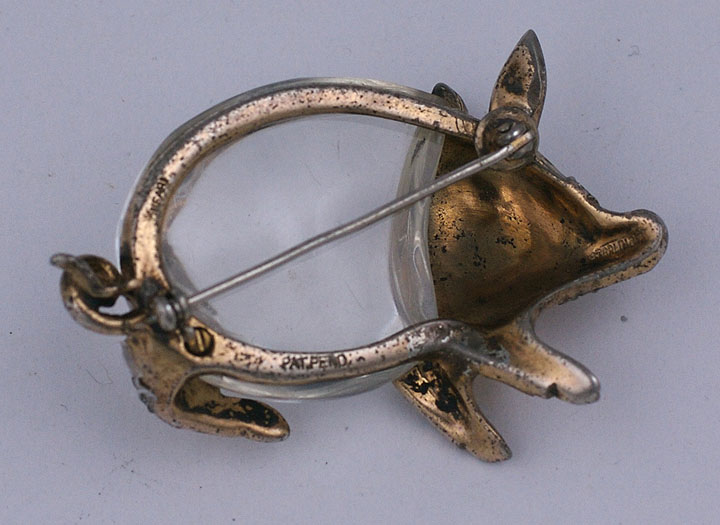 Trifari retro Jelly Belly amusing pig brooch. Designed in 1943 by Alfred Philippe ,this amusing pig brooch is one of the more unusual of Trifari's animal "JELLY BELLY" series. Set in gilt sterling with lucite body.