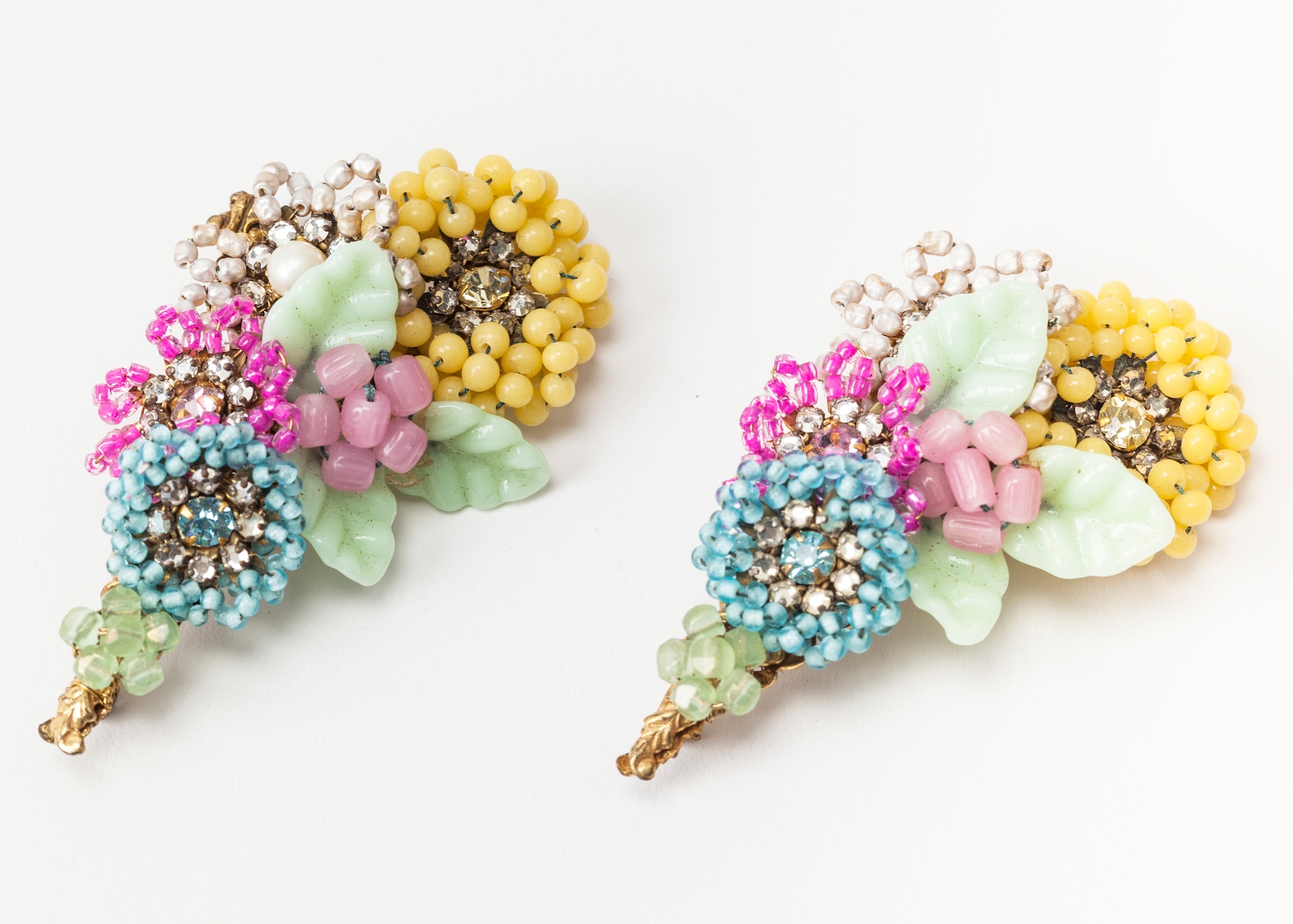 Miriam Haskell intricate multicolor pastel floral Spray brooch. A masterpiece of hand sewn pate de verre round and seed beads, freshwater faux pearls, crystal rose montes and lampwork glass leaves set on signature Russian Gilt filigree base. Early "Horseshoe" mark. 1940's USA. Excellent condition.