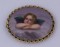 Charming Victorian brooch from the late 19th Century. A cherub perched in the clouds is transfer printed onto porcelain and is set into a twisted and textured 14K gold surround. A modern closure has replaced the original and is ultimately more secure. A small loop on top of brooch can be converted for a pendant as well. 1880's.
