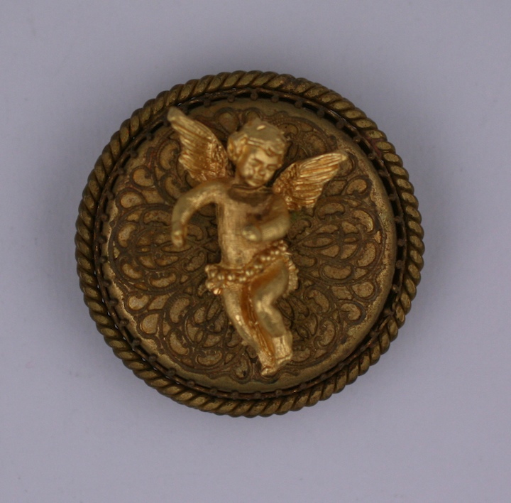 Charming brooch with applied cherub on a filigree base. There is a music box hidden beneath filigree cage. There is an attached pendant fitting as well. Self winding mechanism to operate music box. 1950's USA. 2" x .75" . Excellent condition.