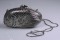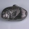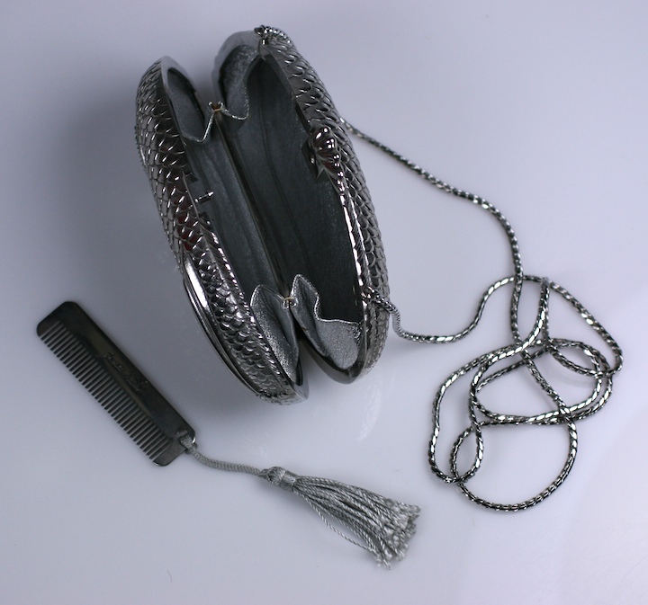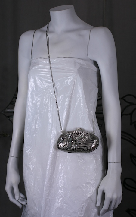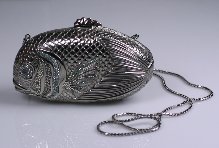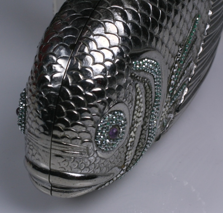 Silvertoned Jeweled fish minaudiere by Judith Leiber with retractable shoulder strap and comb. Pave stones are in aqua, smoke and crystal with genuine amythest cabochon pupils in the eyes on both sides. Realistic detailing with the tail curling back onto itself. Lined in silver kid leather.