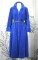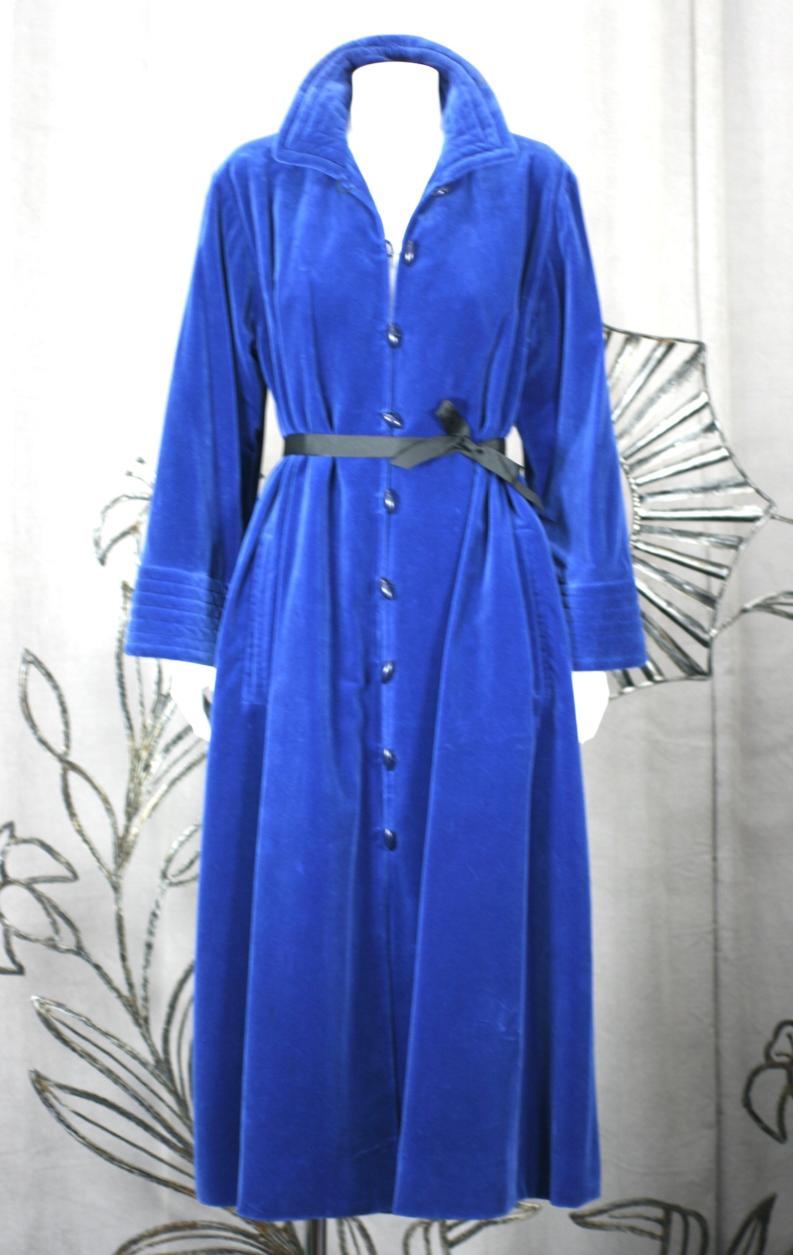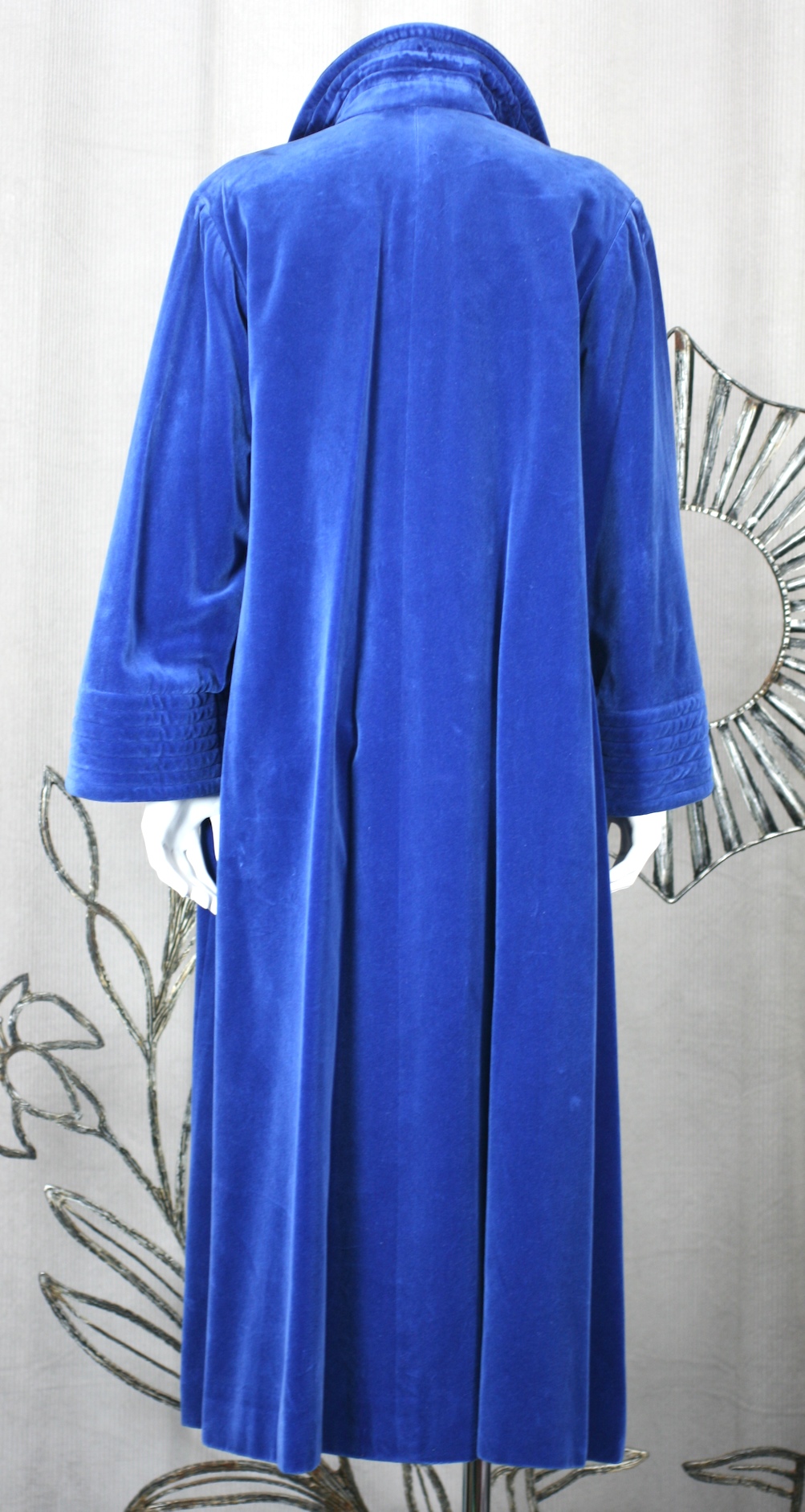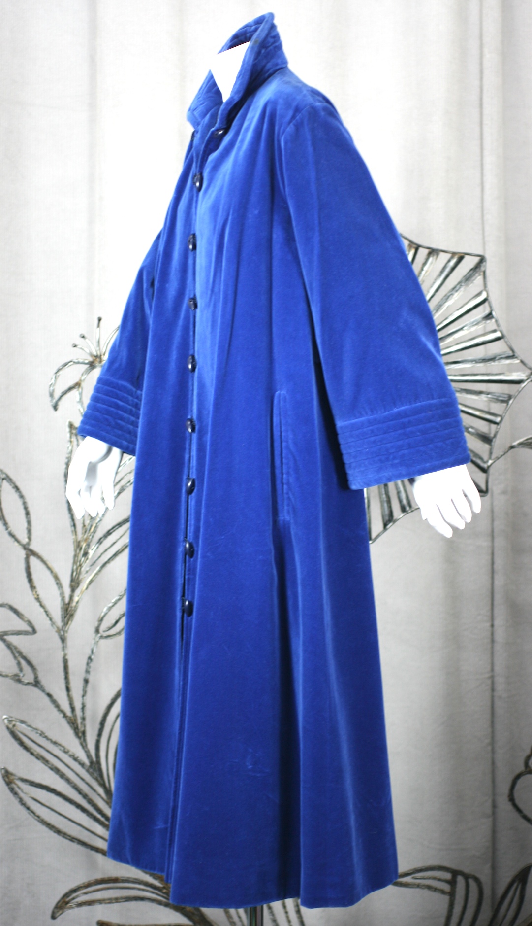 Yves Saint Laurent Rive Gauche corn flower blue cotton velvet long, flared coat. Chinese inspired trapunto stitching with quilted collar and cuffs. Slash pockets and unusual toggle fasteners shaped like small pods. 1980's . France Excellent condition.