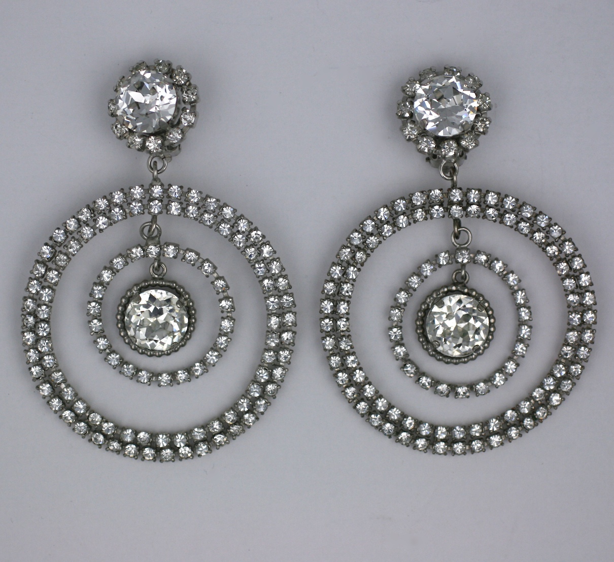 Oversized runway earrings of concentric diamonte hoops with large Swarovski crystals by Chanel, Paris. Clip back fittings, 1980’s France. Excellent condition.