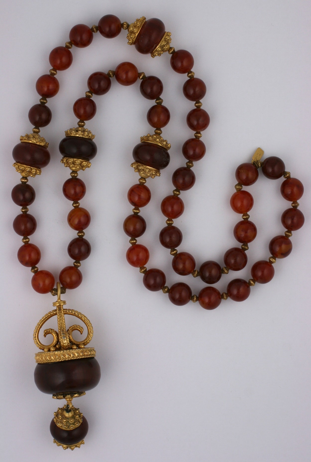 Large faux amber bead necklace in bakelite by Kenneth Jay Lane in the ethnic taste. Oversized beads are spaced with gold beads and a large drop with gilt cap hangs as a pendant. Imposing necklace with Moroccan overtones. 33″ long x 12mm beads, the larger beads are .75″, Drop 4″ x 1.5″. Signed.