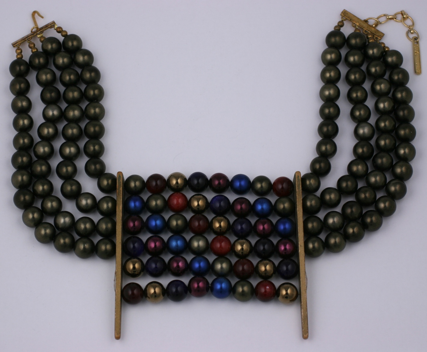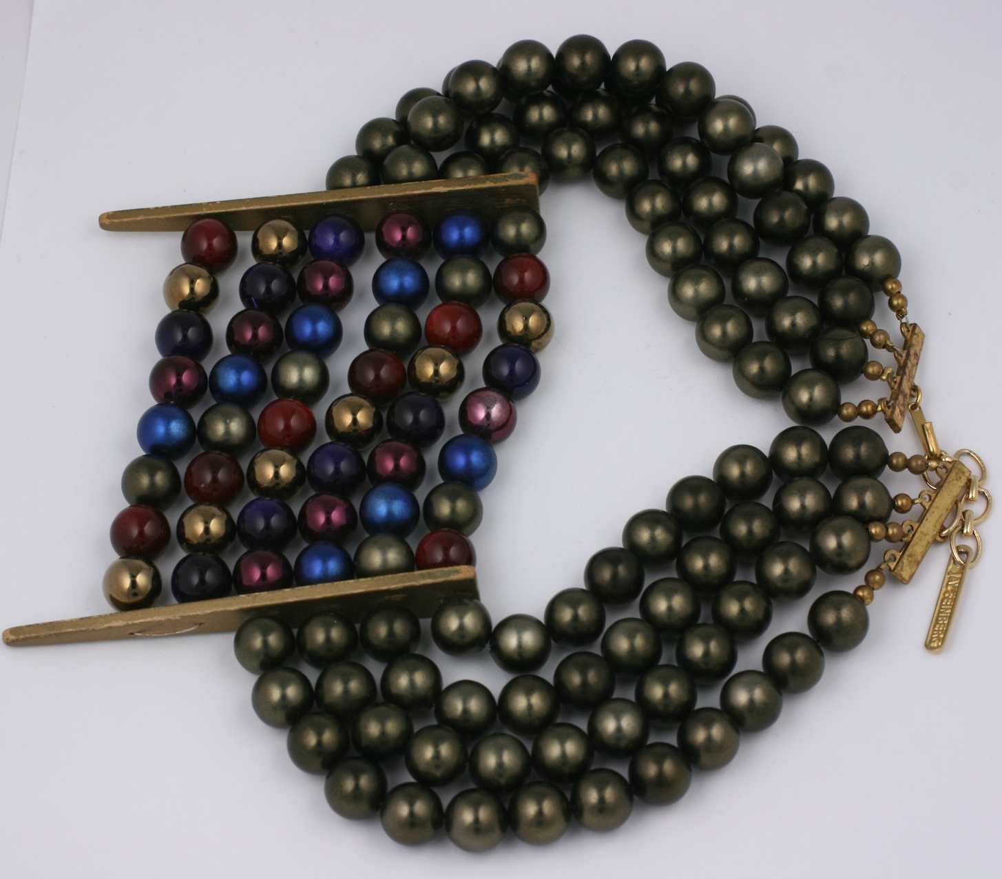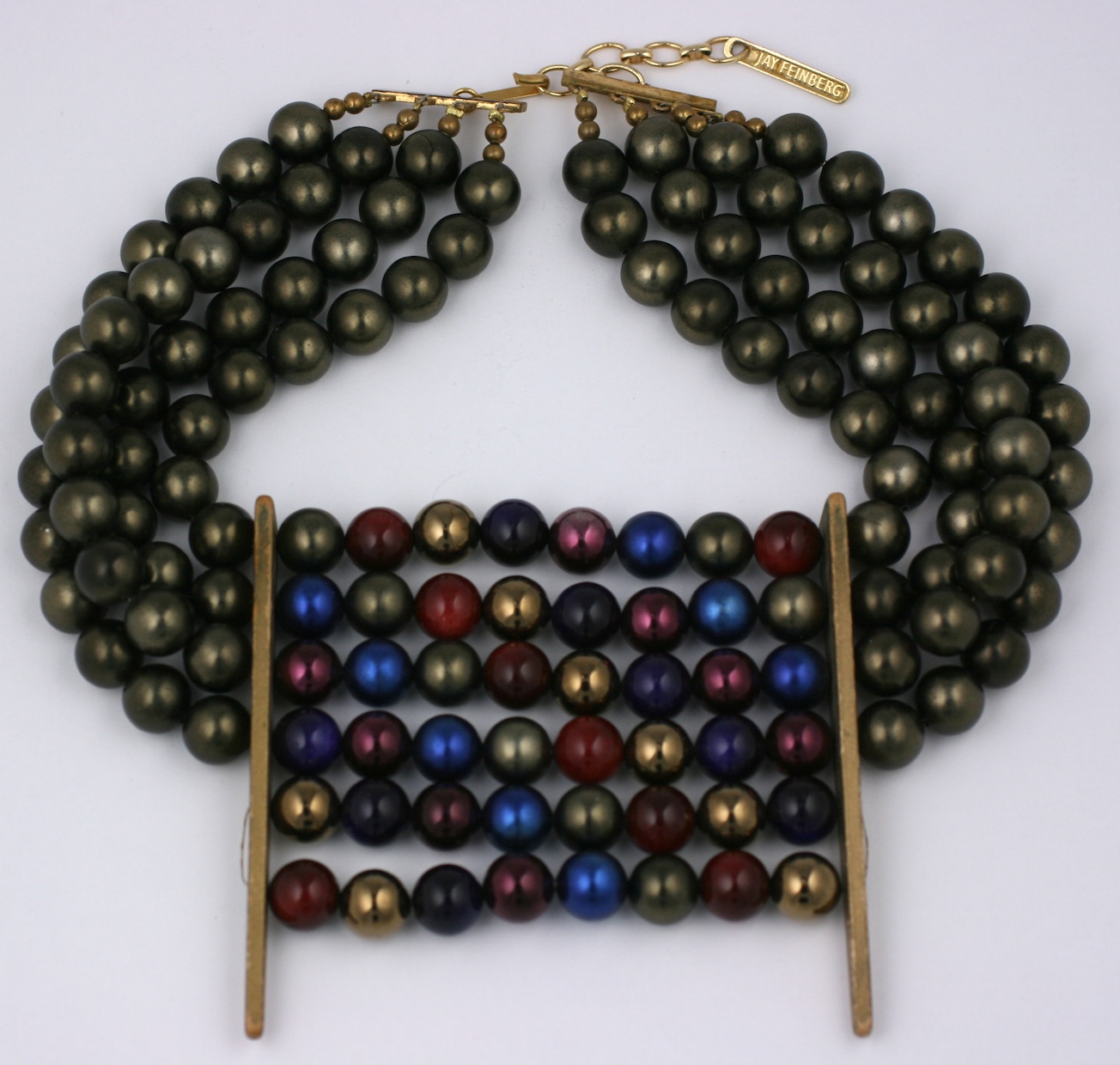Jay Feinberg multi strand collar in bronze toned 12 mm faux pearls with centerpiece of multicolored pearls in wonderful jewel tones. The spacers are large gilt wood elongated triangles. Large and imposing collar with adjustable chain closure. 1980's USA.