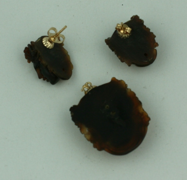 Hand carved tortoiseshell earrings and pendant. High relief carvings with extraordinary detail. These were elements from a larger suite from the Victorian period.
