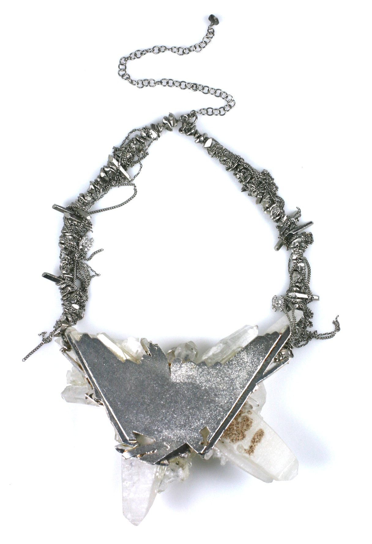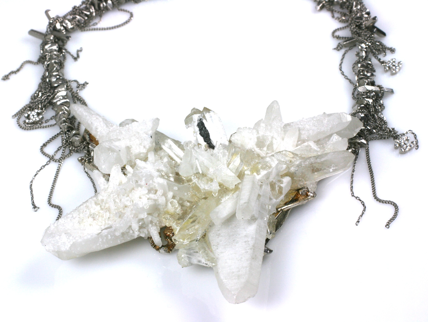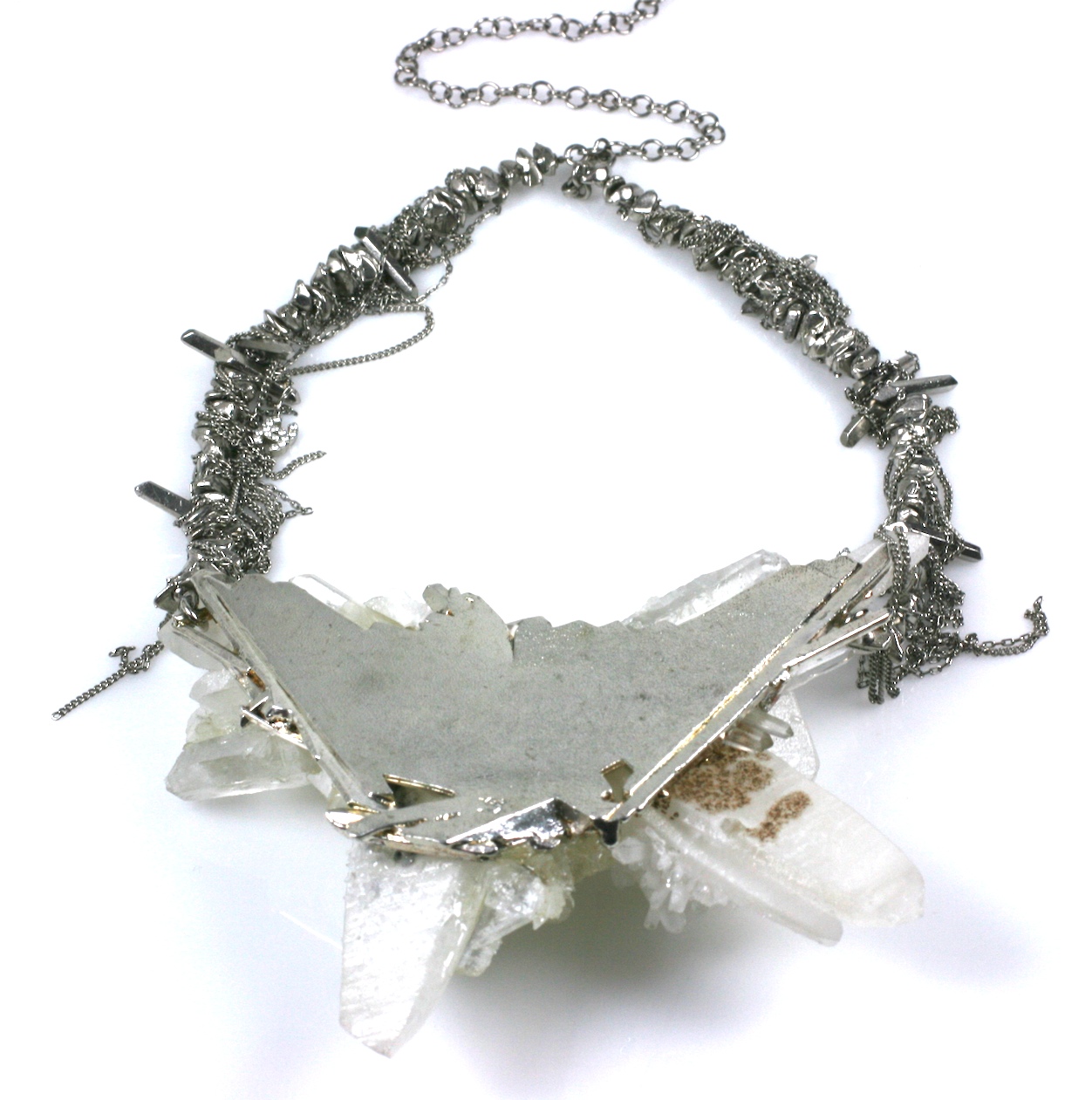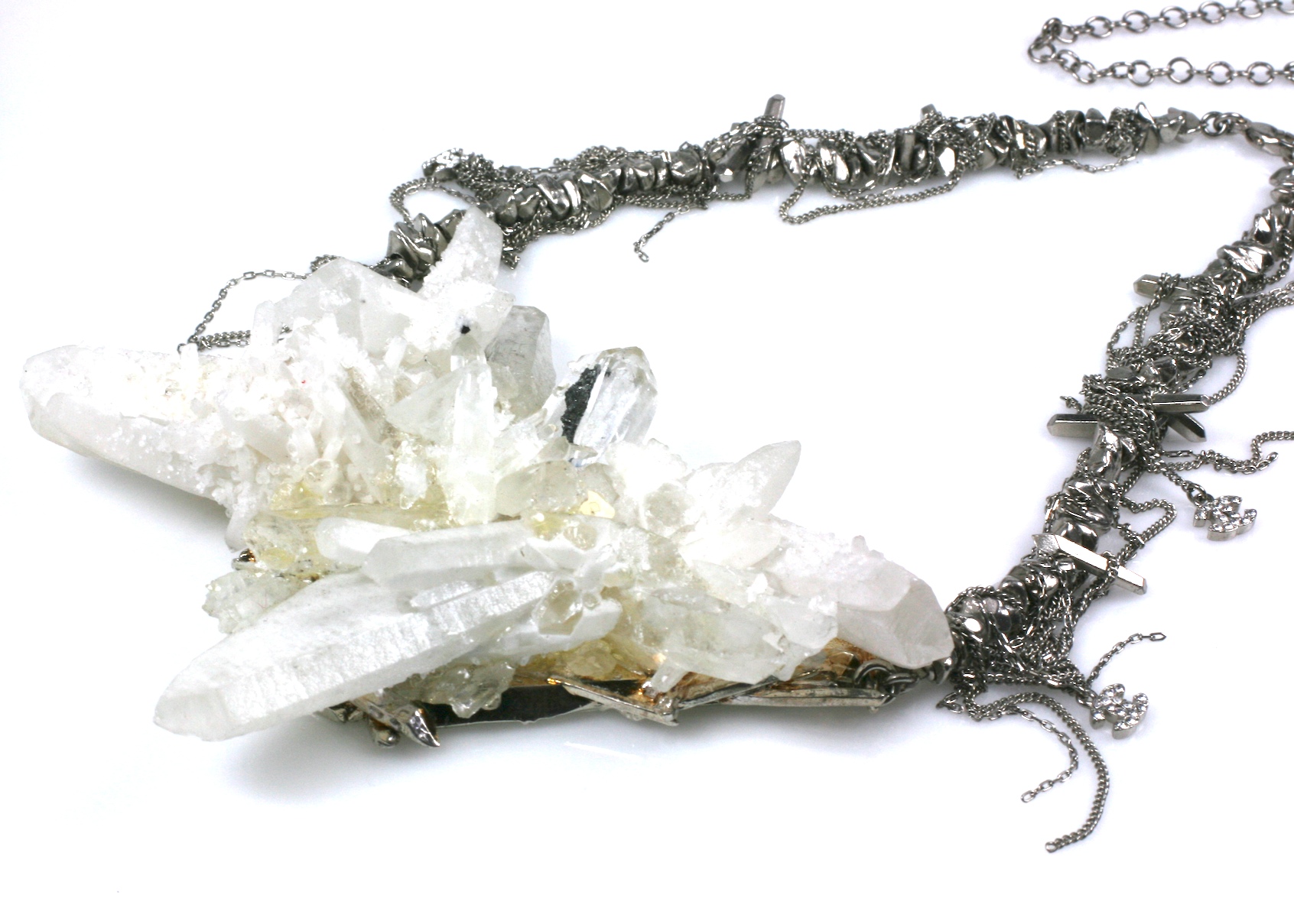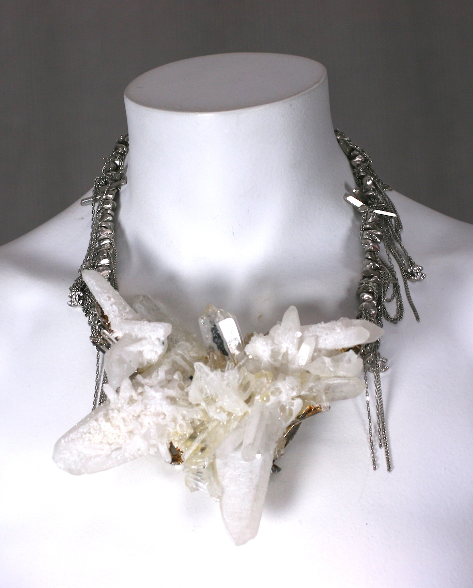 Chanel Rock Crystal Runway "Ice" Necklace from F/W 2010 . This is a one of a kind runway model, never commercialized in stores. A massive rock crystal quartz specimen is mounted on silvered bronze as the centerpiece and hangs from a jangle of silvered chains with cascading pave "CC" logo charms. Collector quality. Size: Pendant 5.5" x 4.5" x 1.25". Total length 19" with 7" extender chain. Chanel F/W 2010 "Iceberg" Show description: "Freja Beha Erichsen and three bears on an ice floe. This was the arctic scene at Chanel, where giant chunks of bona fide iceberg, specially transported from Scandinavia, formed the frozen landscape around which models solemnly splashed through a sea of 'berg-melt in shaggy snow boots with ice-block heels." Fur-fringed embroideries and ice jewelry conspired to create intensely worked ruffled and beaded silhouettes that glinted with rock-crystal neckpieces and fistfuls of rings.