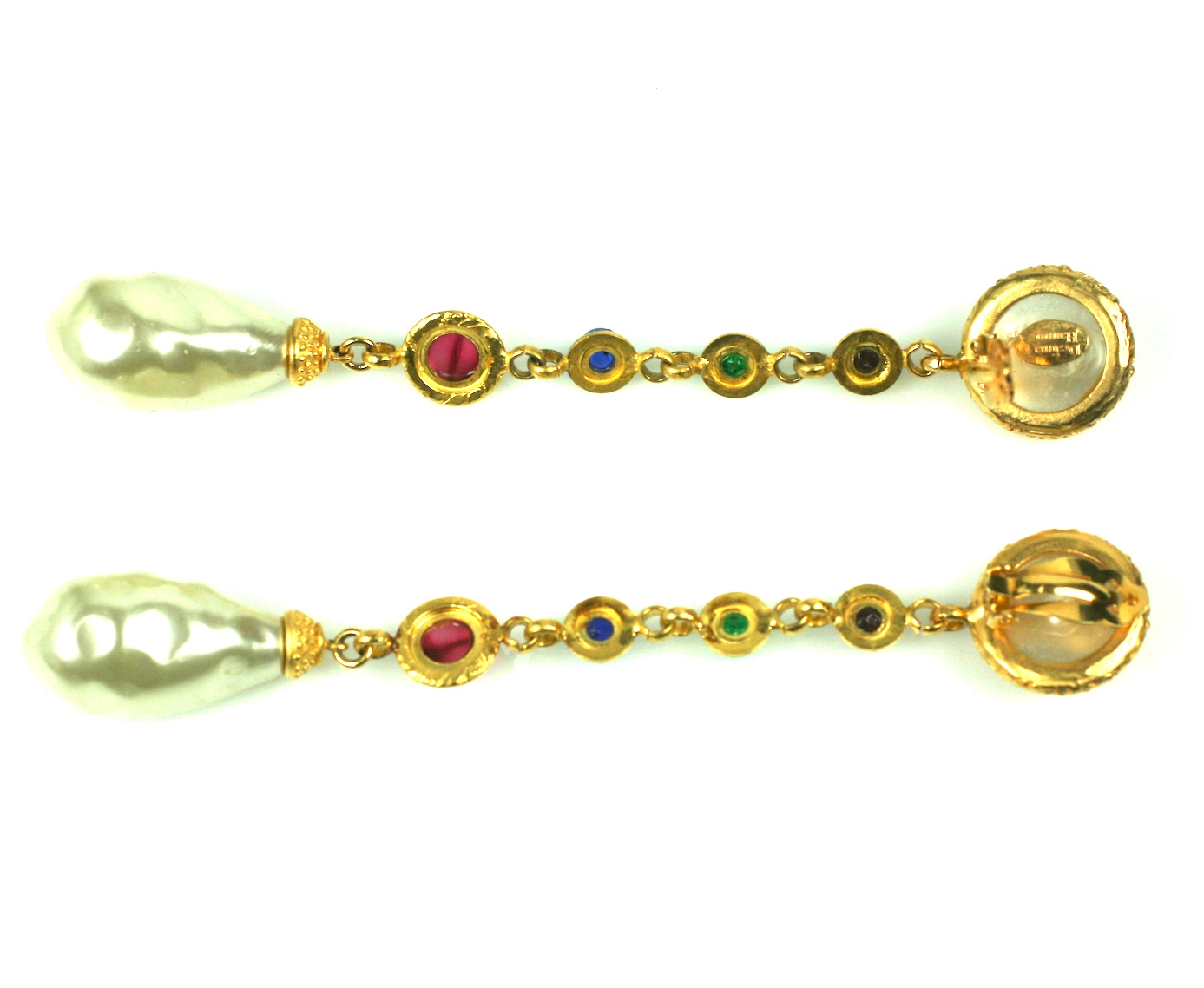 Deanna Hamro Long Pearl Poured Glass Earrings, Gripoix. In the 1980's American designer Deanna Hamro commissioned pieces to be manufactured by Gripoix, Paris. These earrings are a product of that collaboration with topaz, emerald, sapphire and ruby glass cabochons.