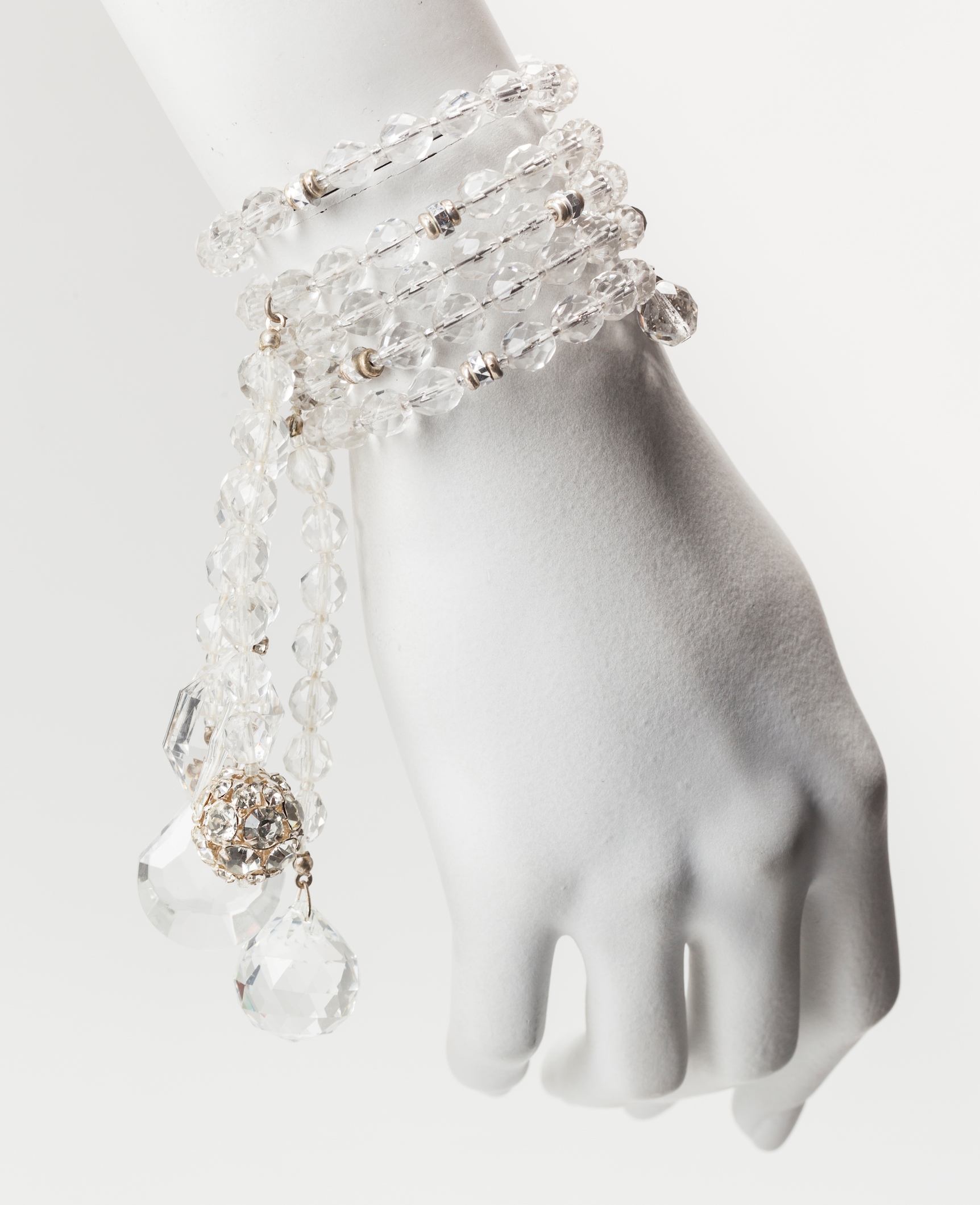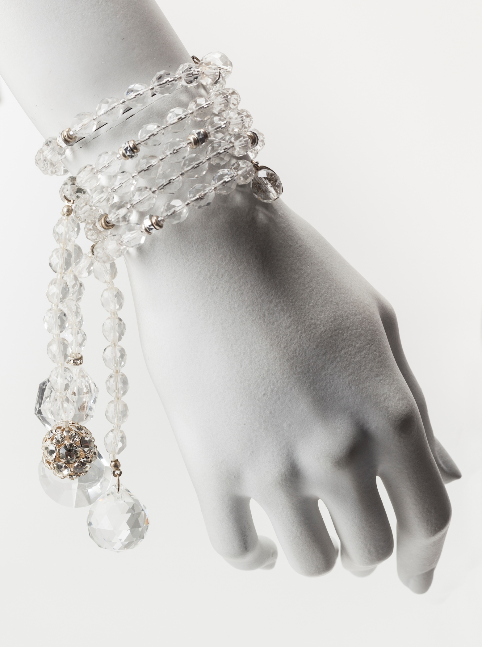 Miriam Haskell five row crystal wrap bracelet of faceted round crystal beads, and silver gilt jewel cut rondelles with dramatic trendrils of chandelier glass crystals, lucite crystal prisms, and crystal paste set beads. Excellent condition. 1960's USA.