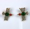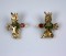 Chanel Sparrow ear clips of faux ruby and faux emerald poured glass cabochons (Maison Gripoix) set in antique gilt metal with wings and tail, hand prong set with crystal pave stones. 2" x 2.25" high. 1980's France. Excellent condition.