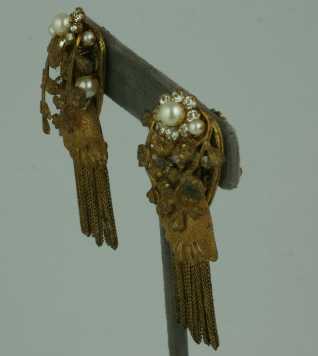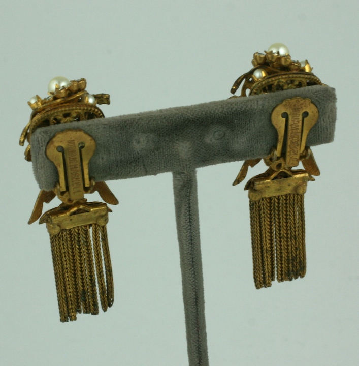 Attractive Miriam Haskell earrings in signature Russian gilt with pearls and pave accents. 1950s USA. 2" length.