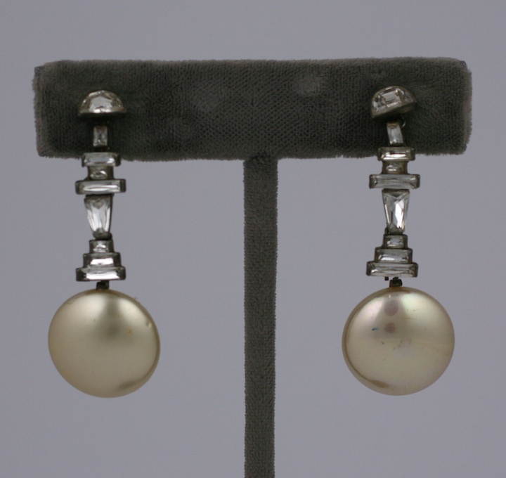 Attractive art deco paste sterling earrings with fancy cut baguettes articulated with a large tablet faux pearl drop. Screw back fittings. 2″.