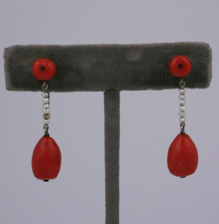 Antique genuine coral earrings with natural pearls with sterling silver screw back fittings from the Art Deco period. Lovely color in the coral.