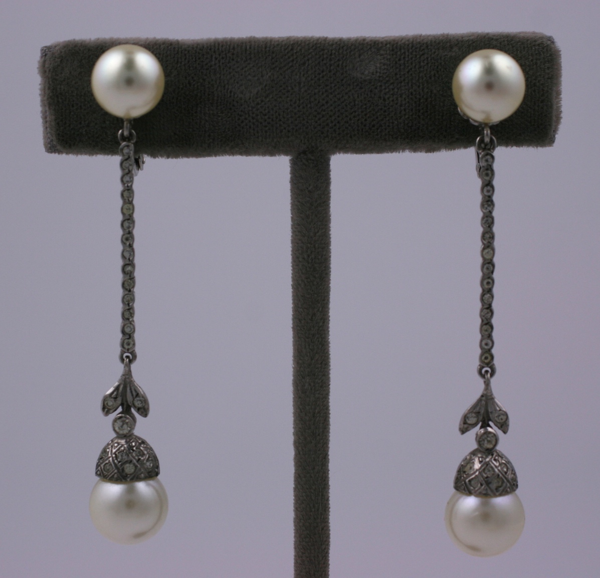 Art Deco silver paste and faux pearl long drop earrings. Clip back fittings set in 835 grade silver. 1920’s European.